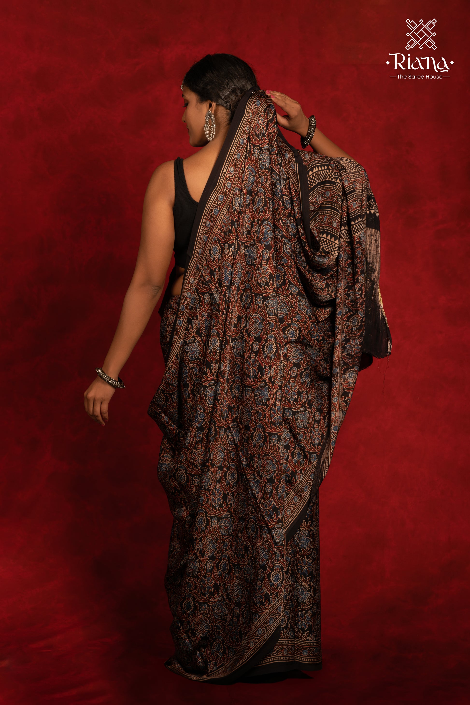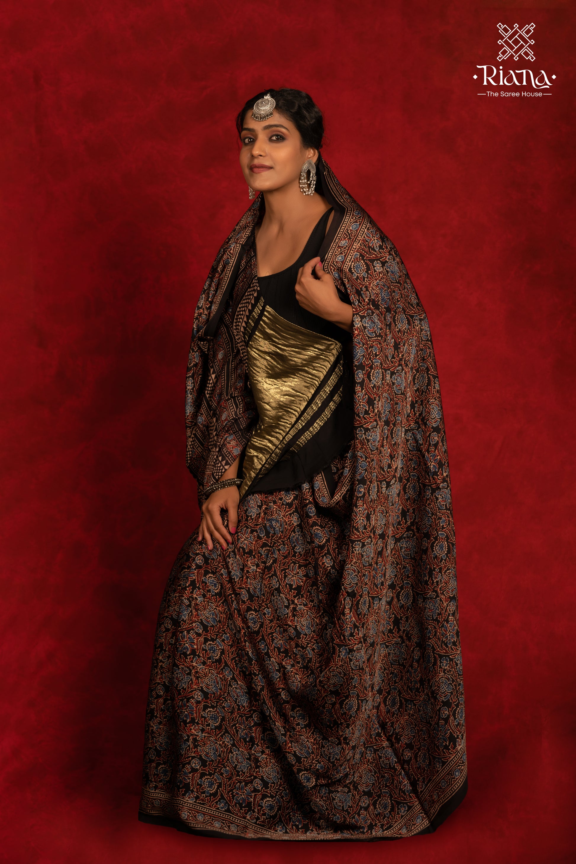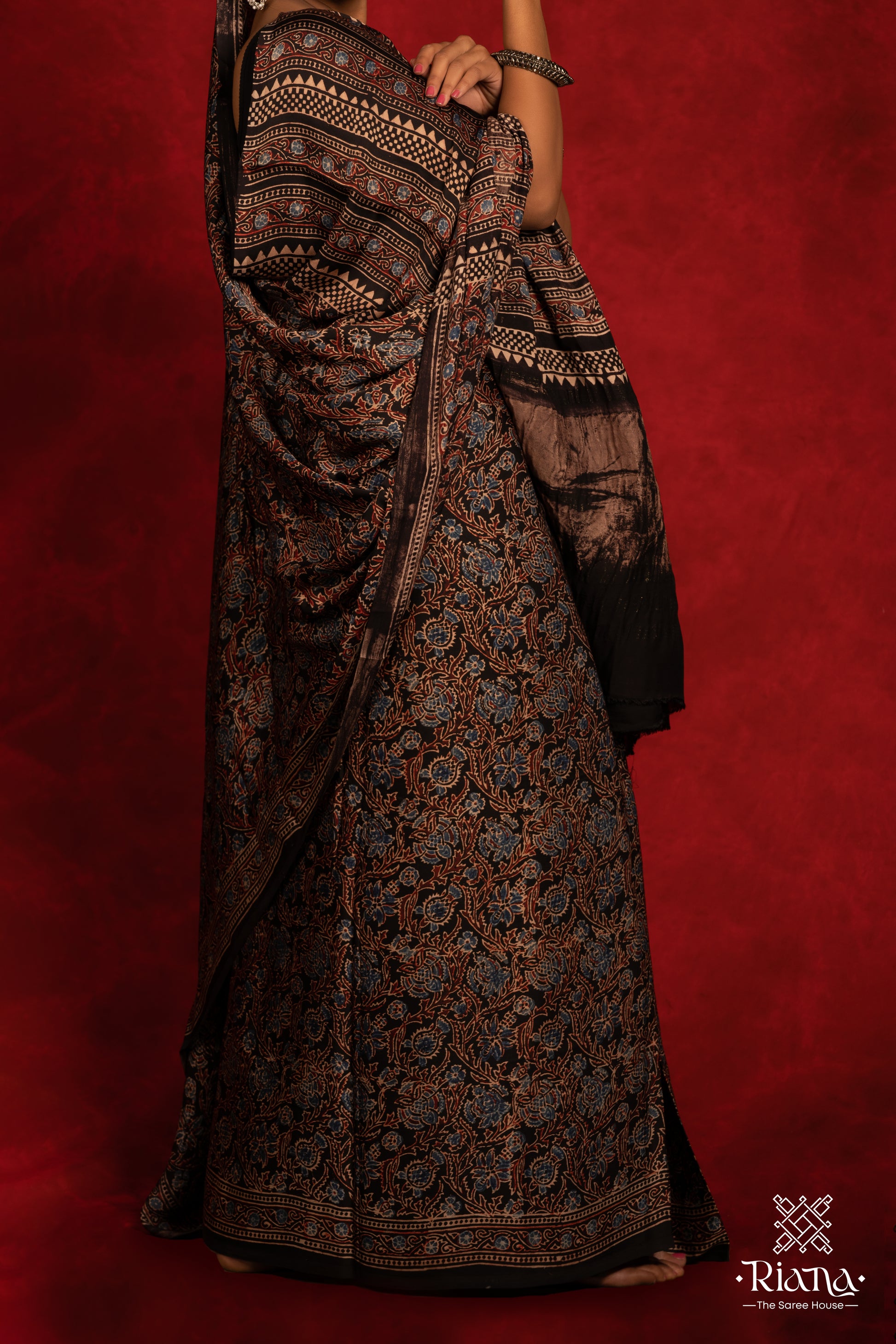 Indulge in the luxury of our Modal Silk Handprinted Ajrakh Saree, crafted with natural dyes. Each piece features intricate Ajrakh patterns, showcasing traditional artistry. The soft, lustrous modal silk drapes beautifully, making it perfect for any occasion. Embrace timeless elegance with this eco-friendly, handcrafted masterpiece.