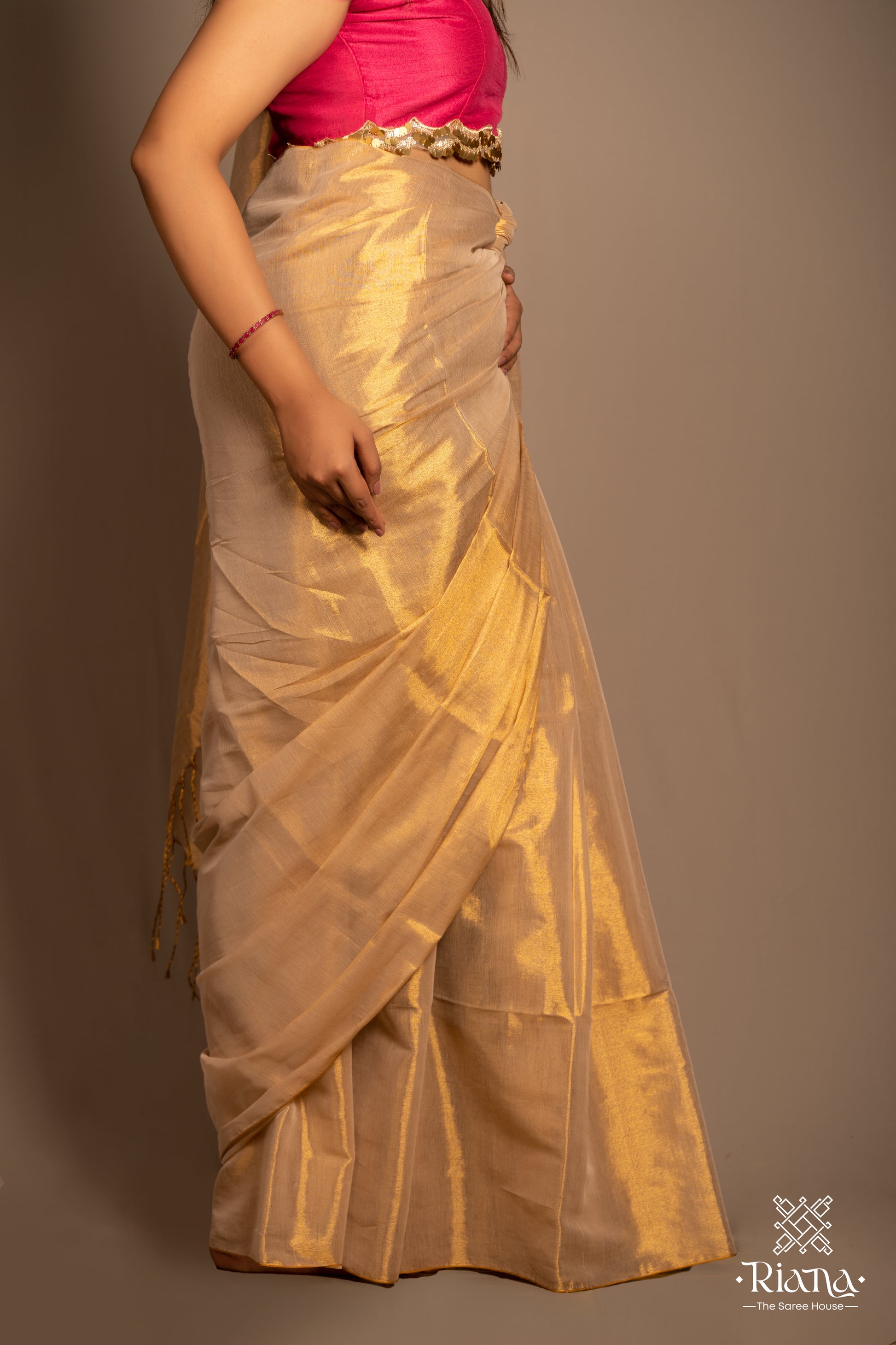 Embrace luxury with our Tissue Cotton Handloom Saree. Crafted by skilled artisans, it combines the elegance of tissue fabric with the comfort of cotton. Its delicate sheen and intricate patterns make it perfect for special occasions, offering a sophisticated touch to your ensemble. A timeless addition to your wardrobe.