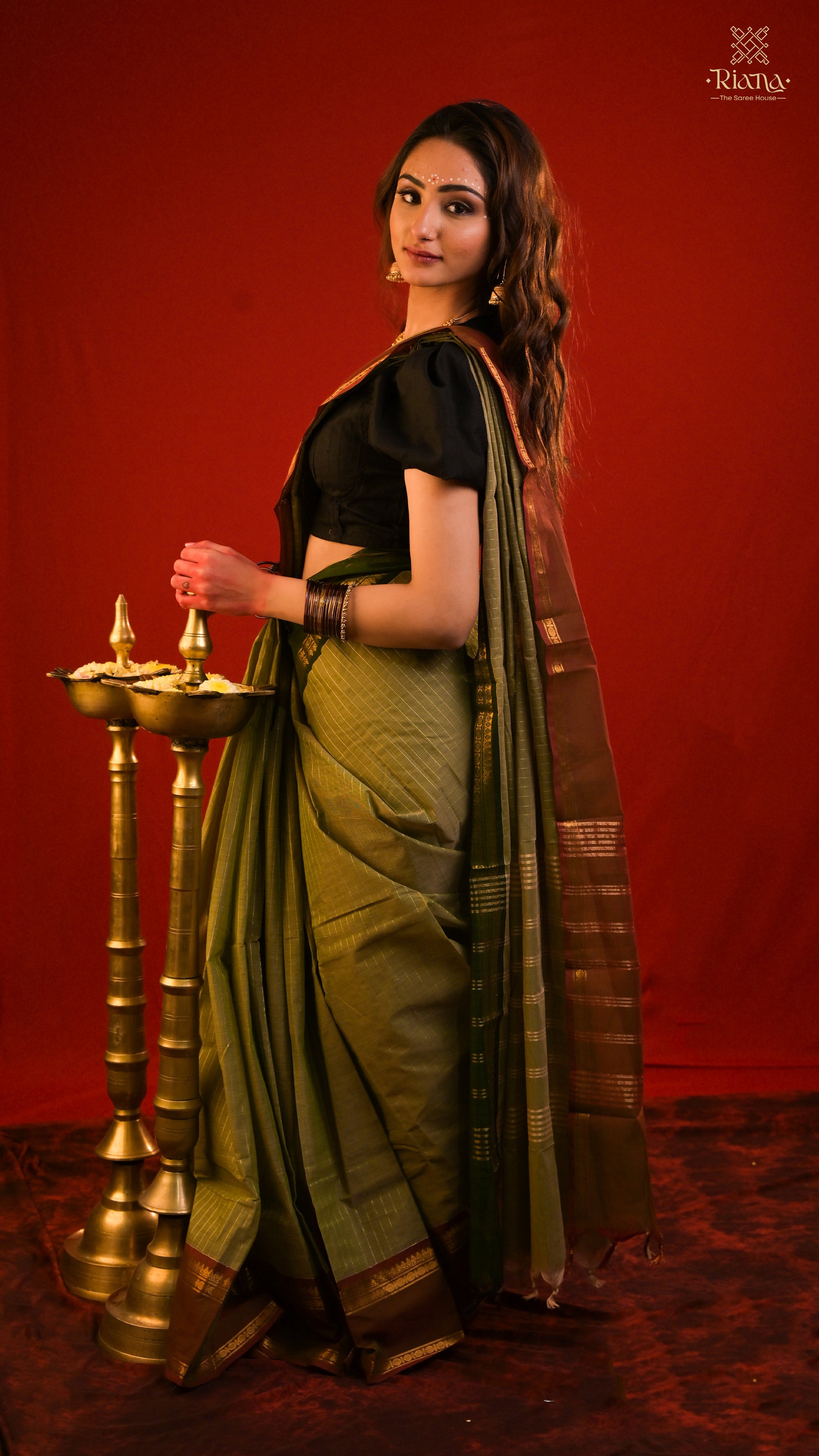 Dakshi reflects the beauty of tradition with temple, floral, and nature-inspired motifs. Its contrasting temple or zari borders and graceful, breathable drape make it a weave of comfort and celebration.