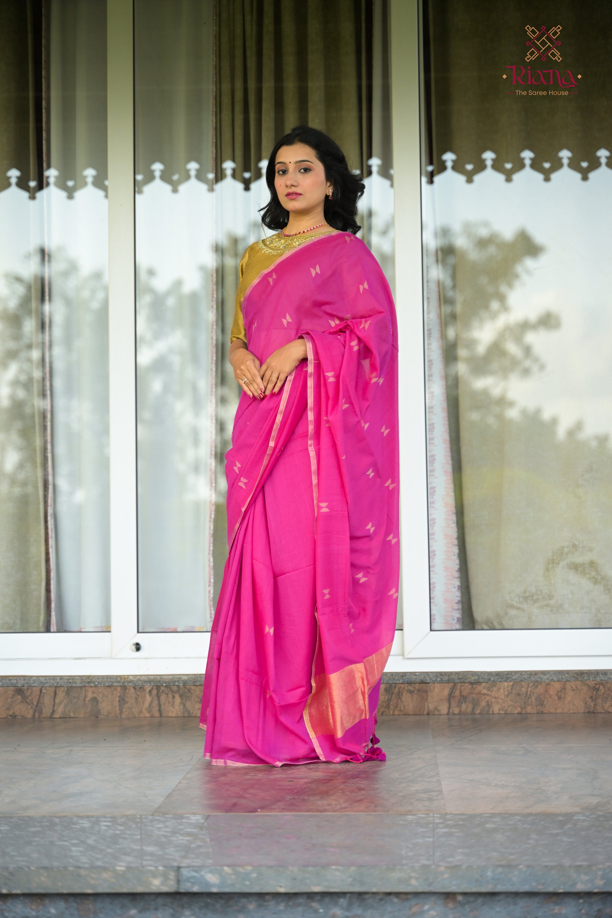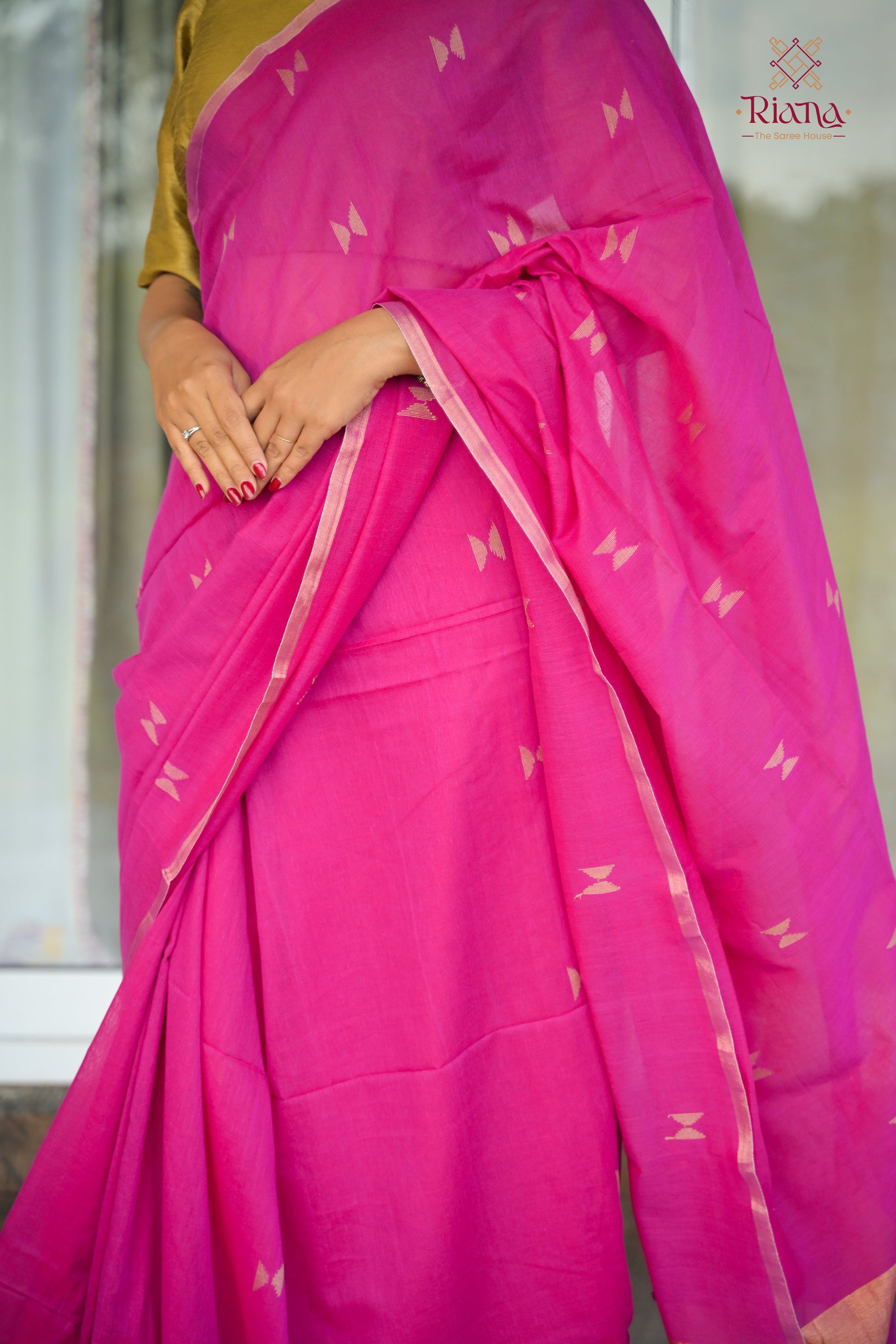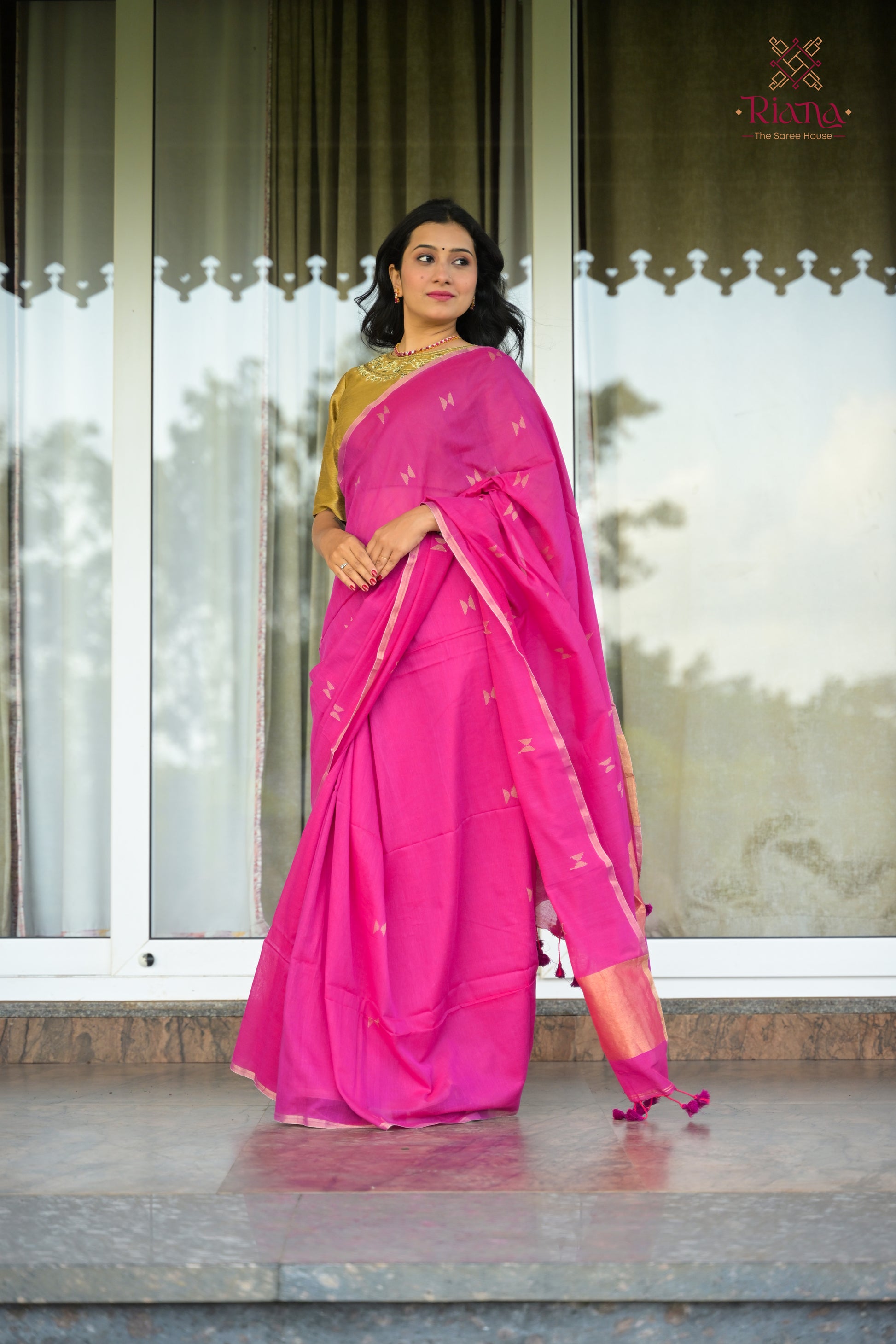 A dark pink cotton saree that beats with the emotion of a heart wide open. Bold yet tender, it’s a drape of pure feeling — where love, longing, and strength meet in every thread.