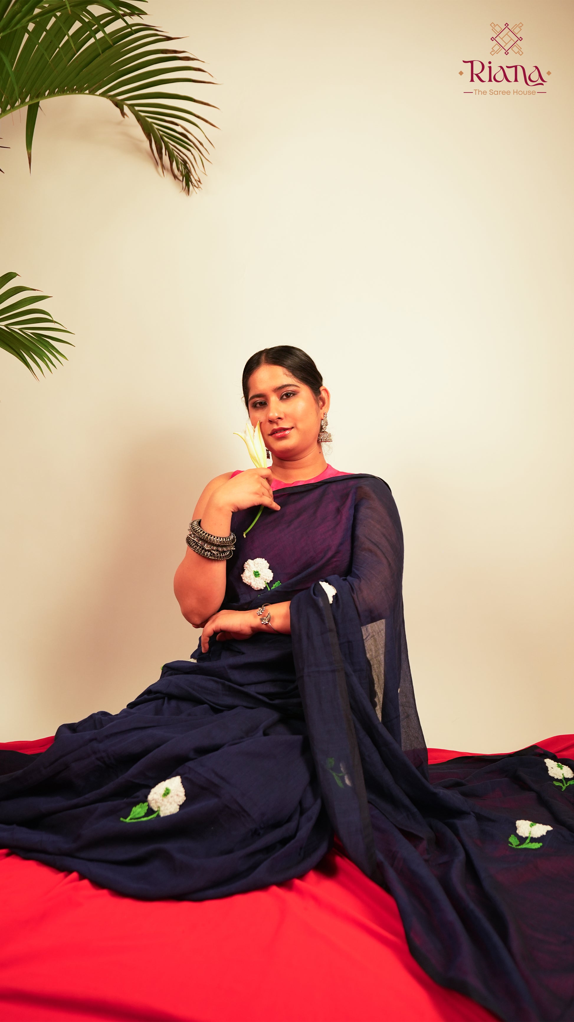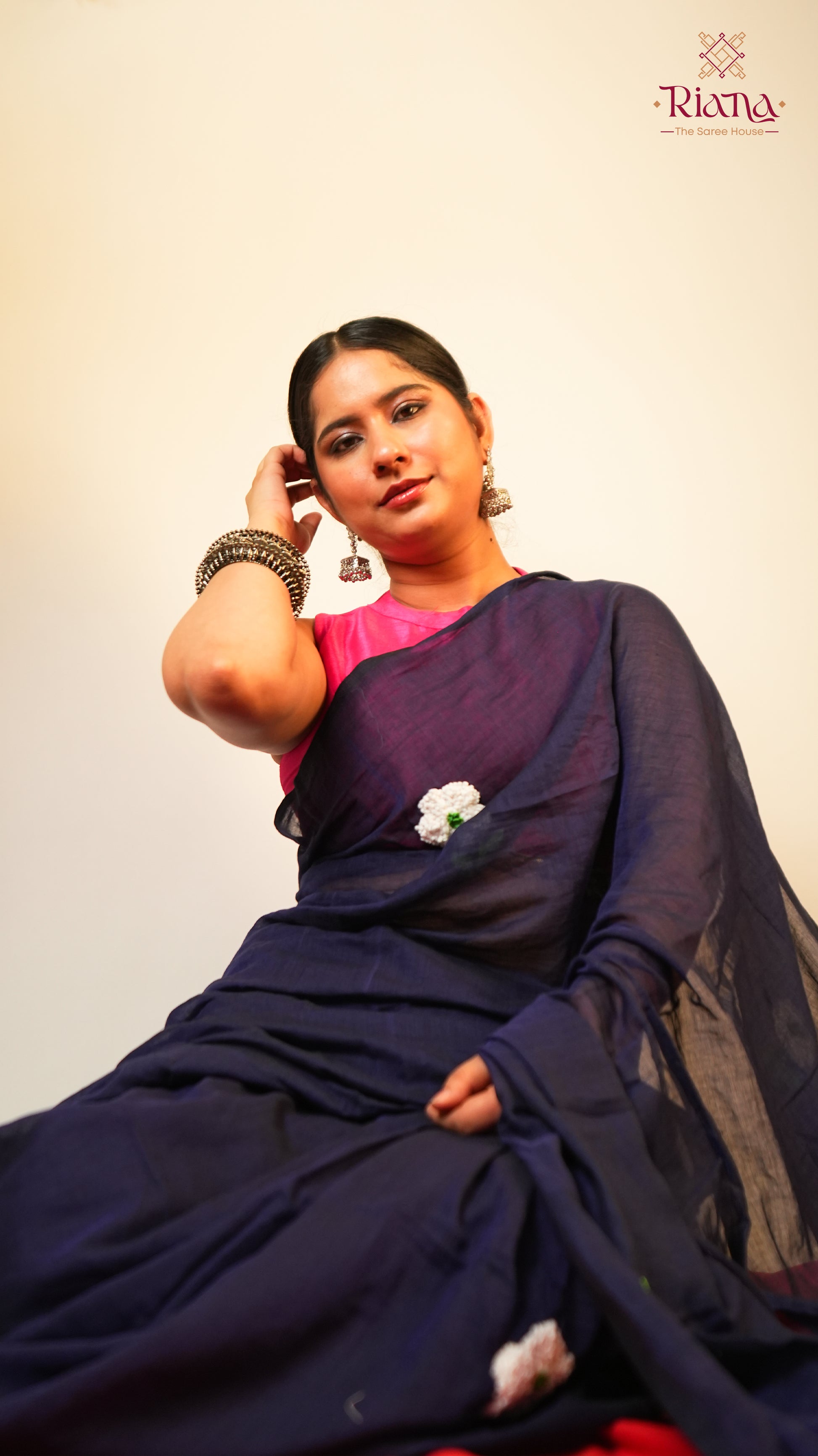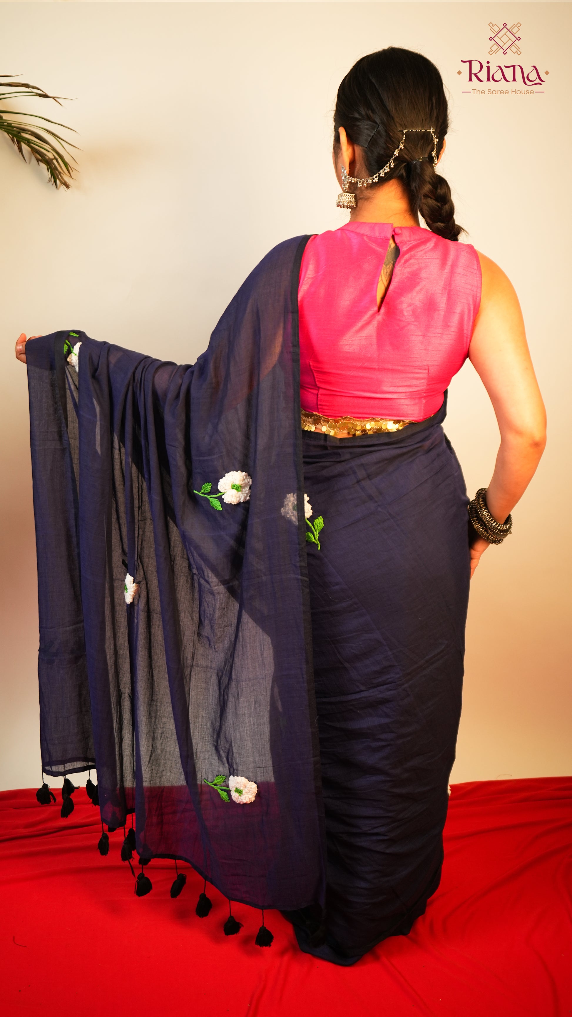 This saree beautifully weaves together the richness of navy blue with subtle undertones of midnight hues, creating a graceful expression of depth and sophistication. Crafted from lightweight, breathable fabric, it’s perfect for festive evenings and intimate gatherings, offering a seamless blend of elegance and comfort.