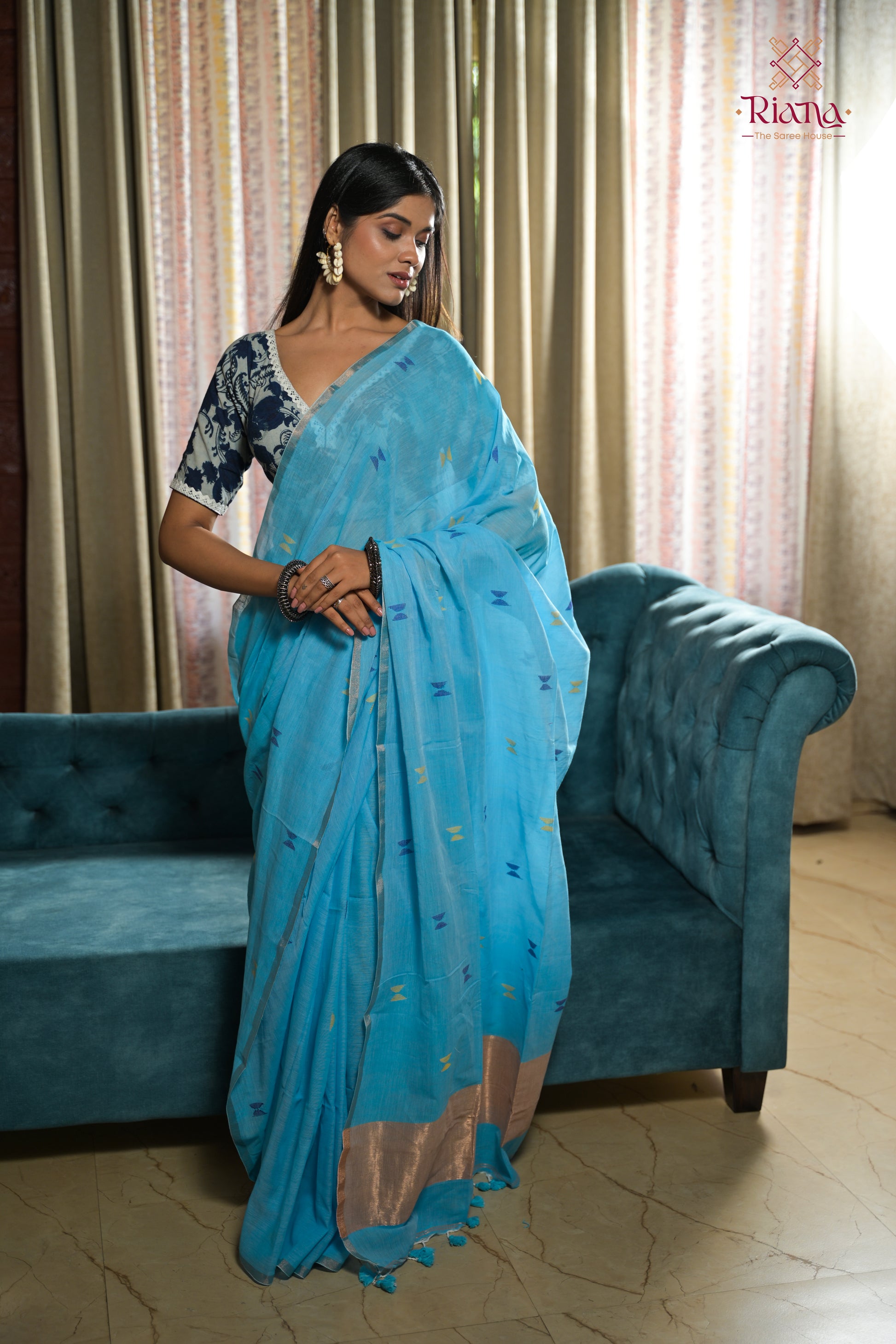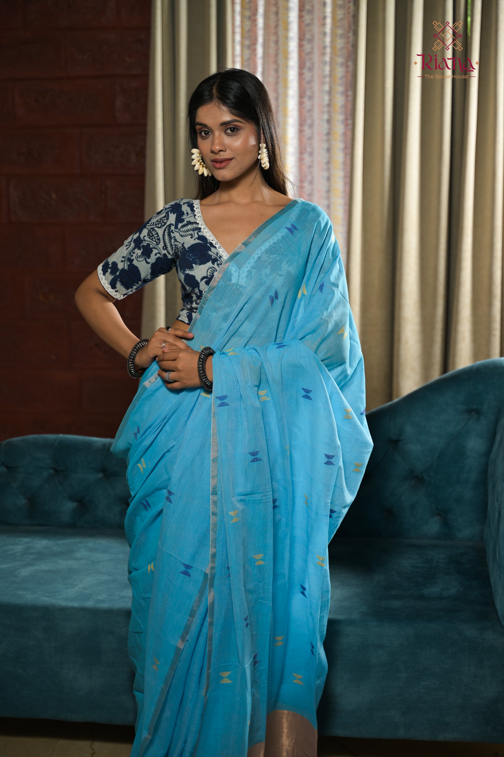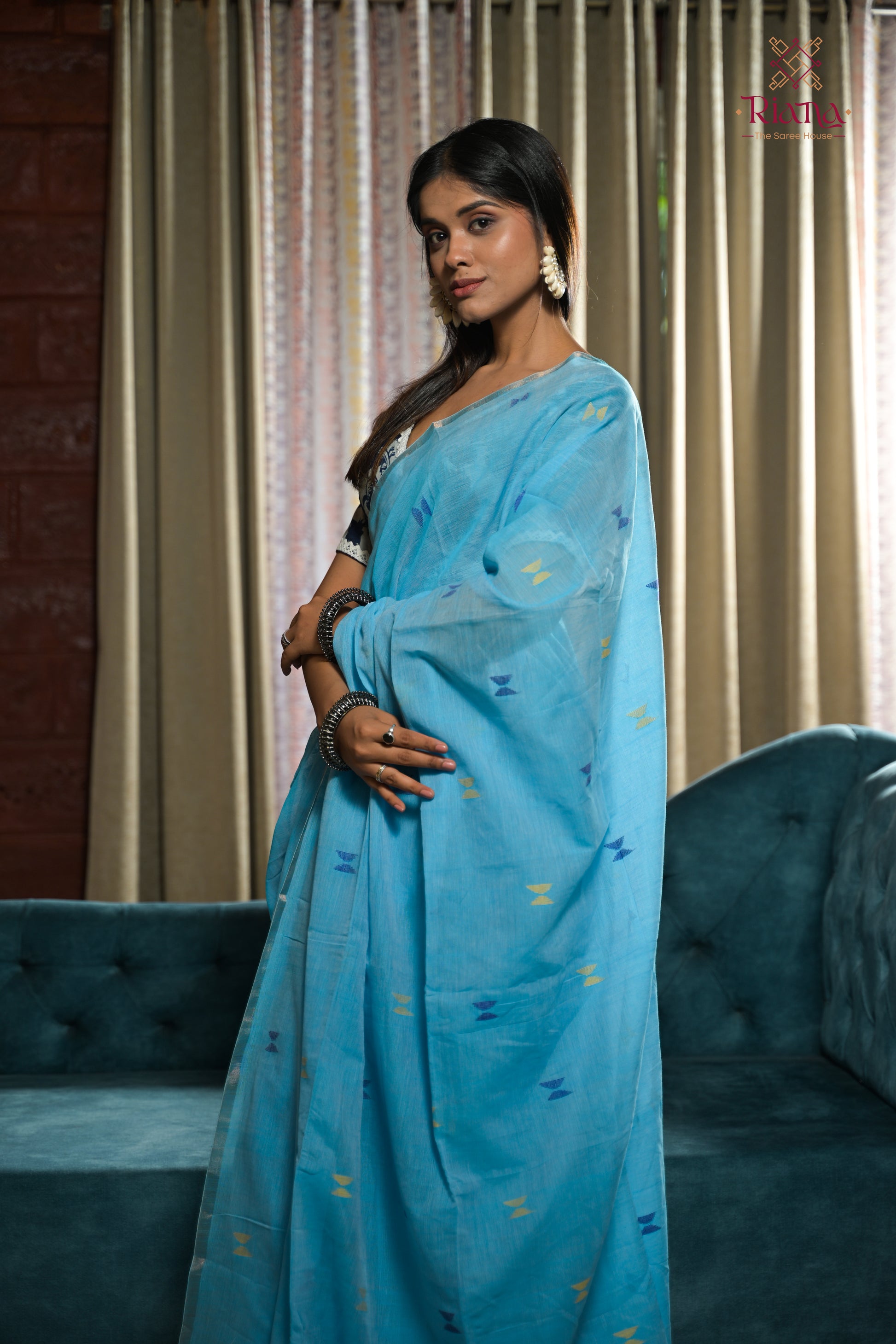 A soft sky blue saree that brings a feeling of peace and freshness.