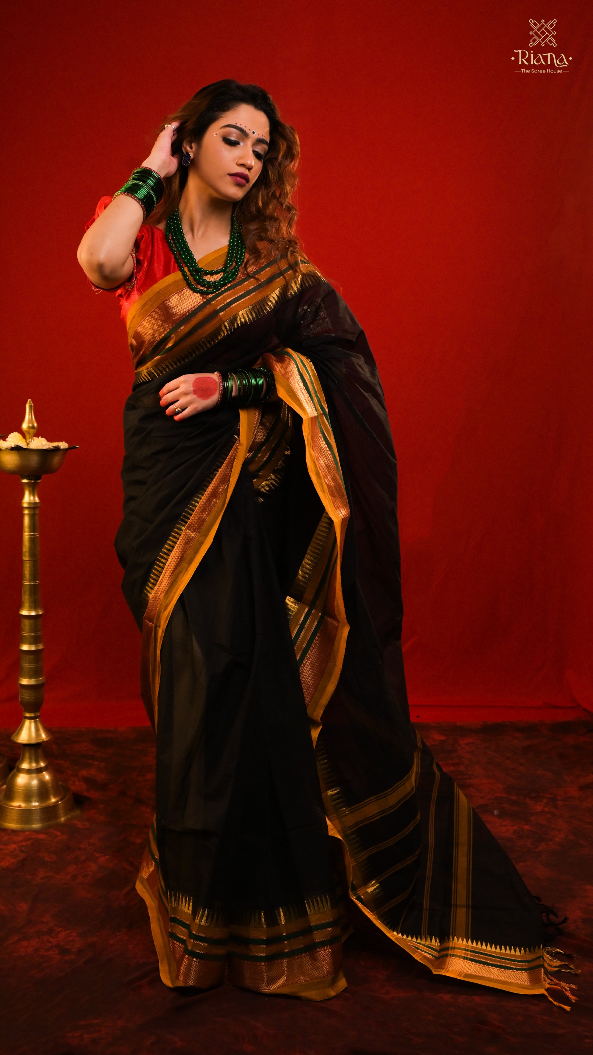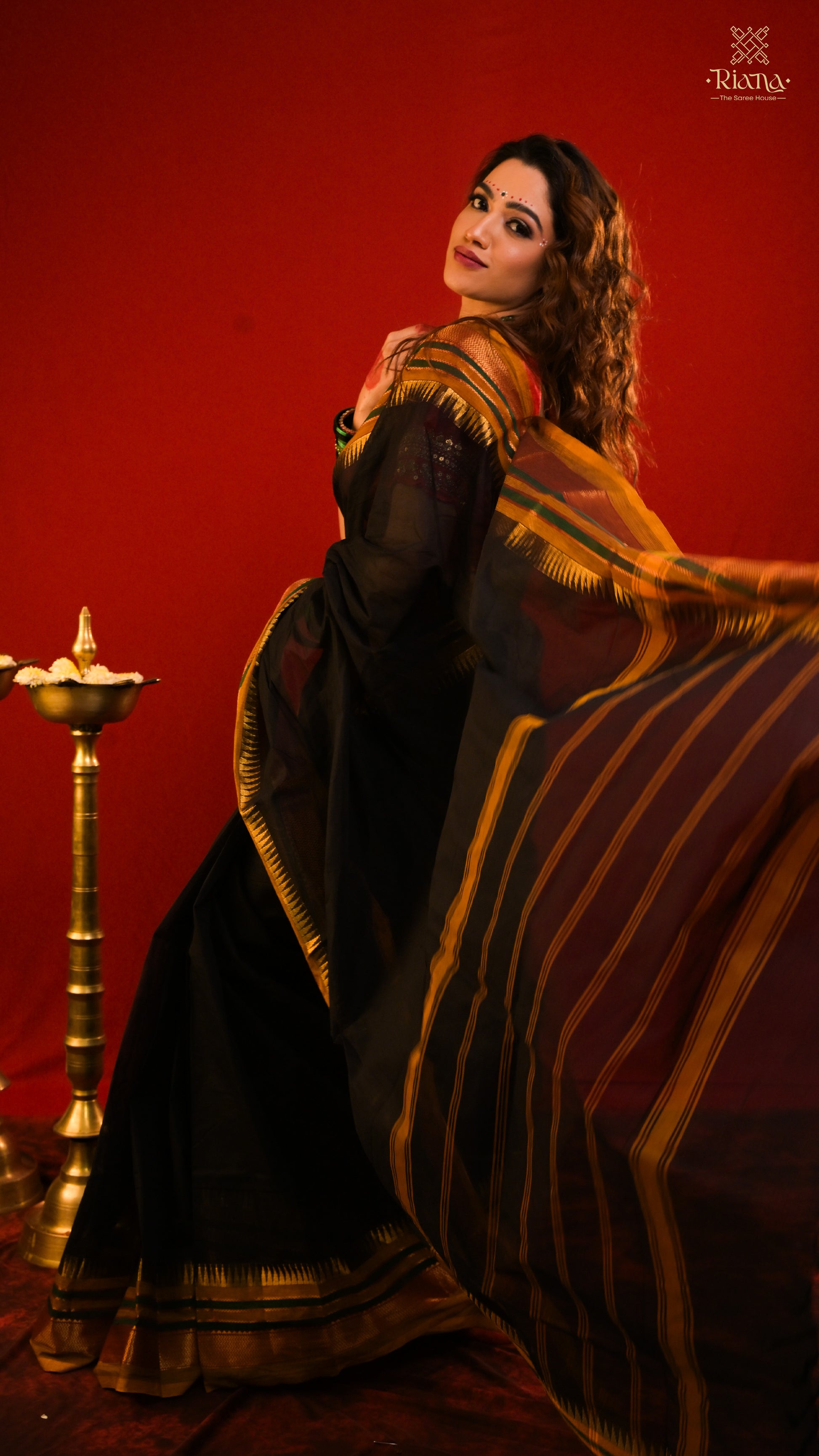 A pure handloom Kanchipuram saree adorned with traditional temple motifs, flowing into a pallu of rich, intricately woven patterns. A perfect blend of heritage and elegance, crafted for festive grandeur