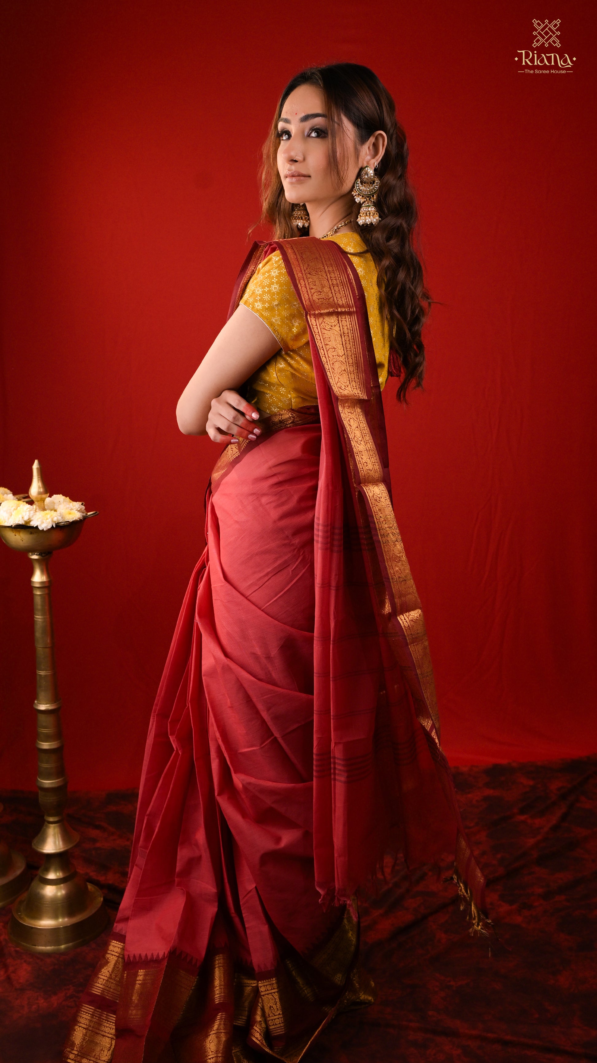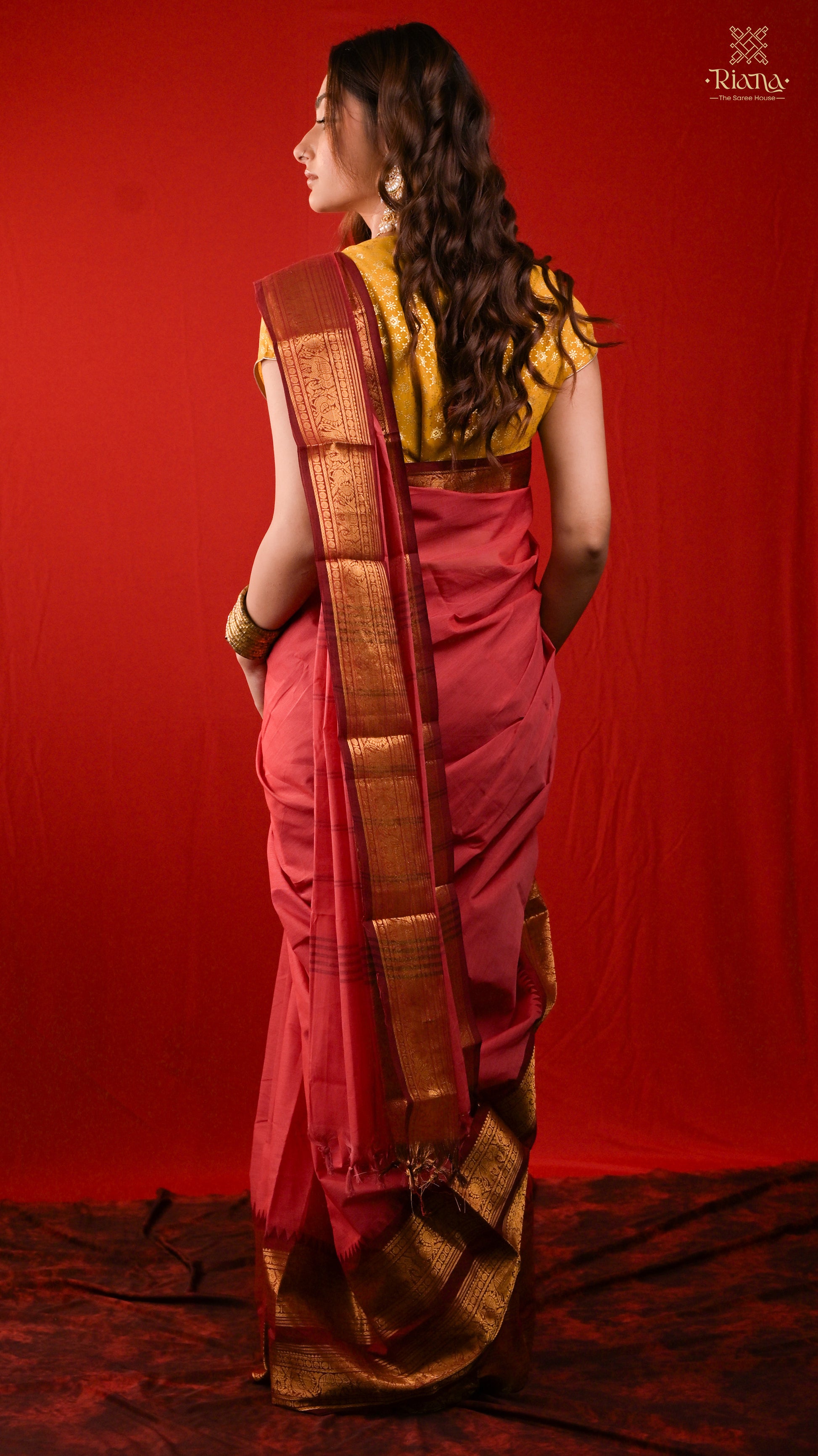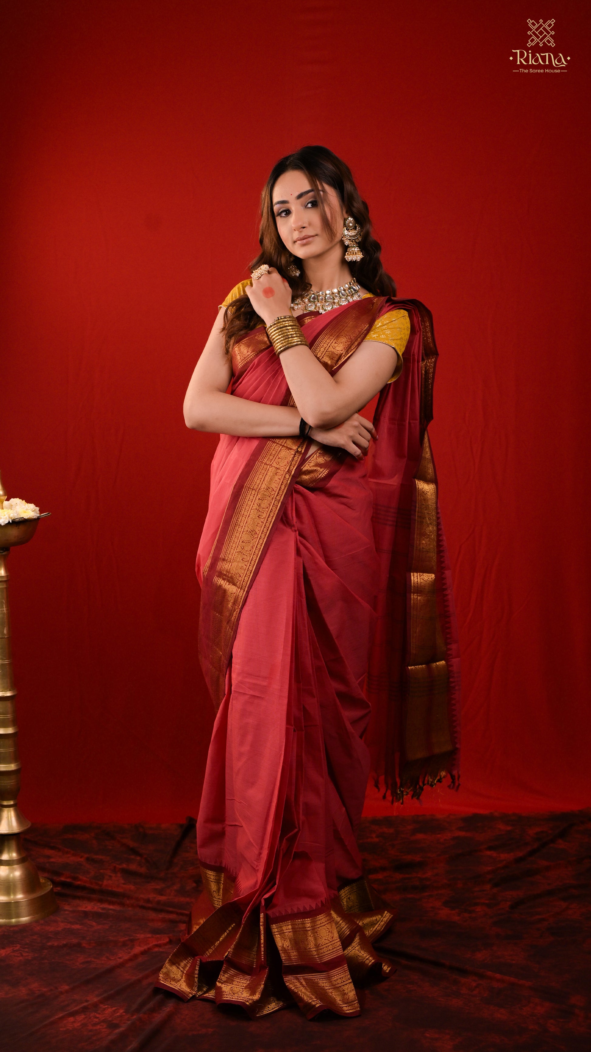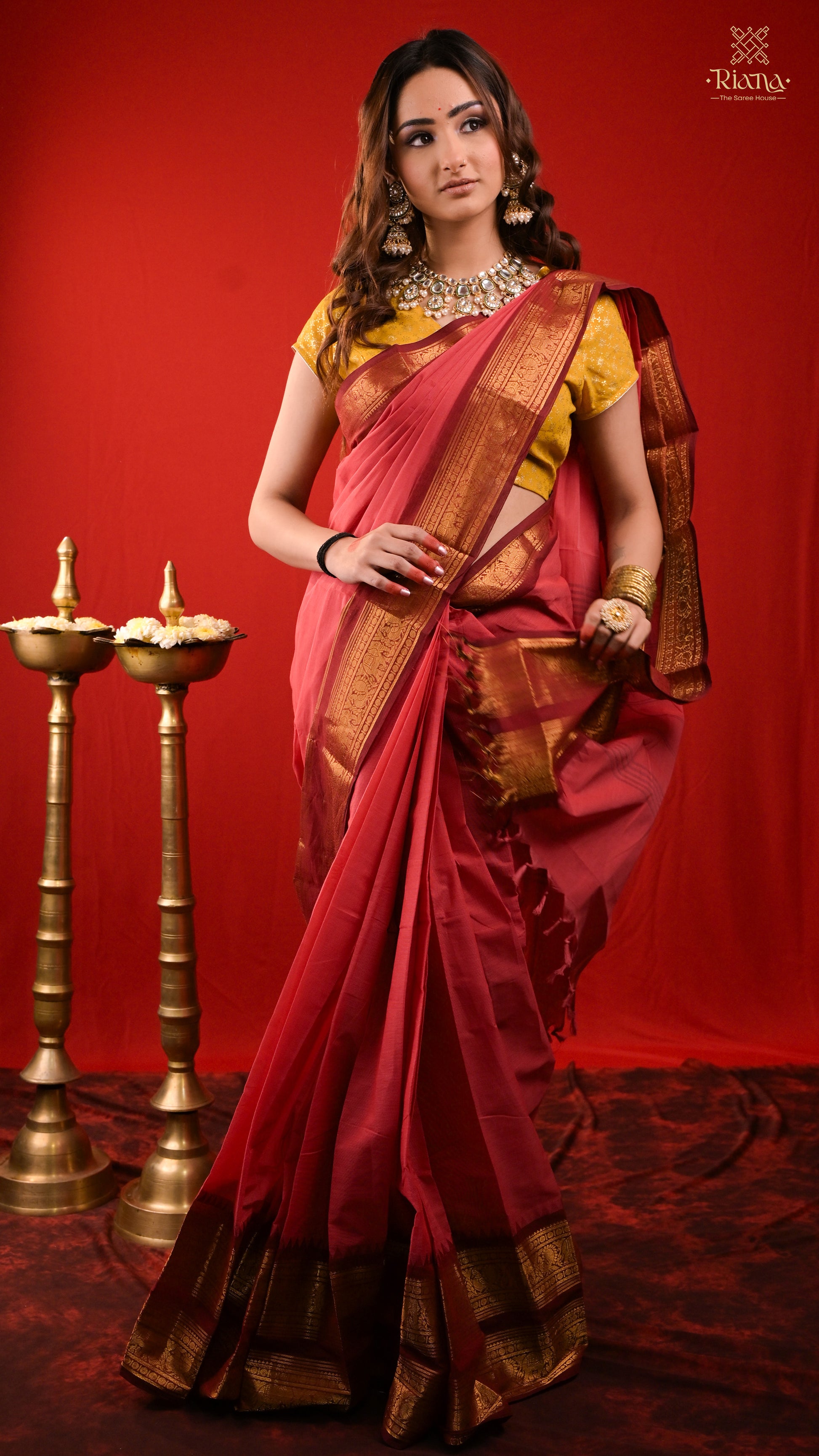 celebrates tradition with motifs that reflect India’s rich heritage. Zari handwoven borders add elegance and structure to each design. The richly woven pallu completes the look with intricate patterns, perfect for festive and special occasions.