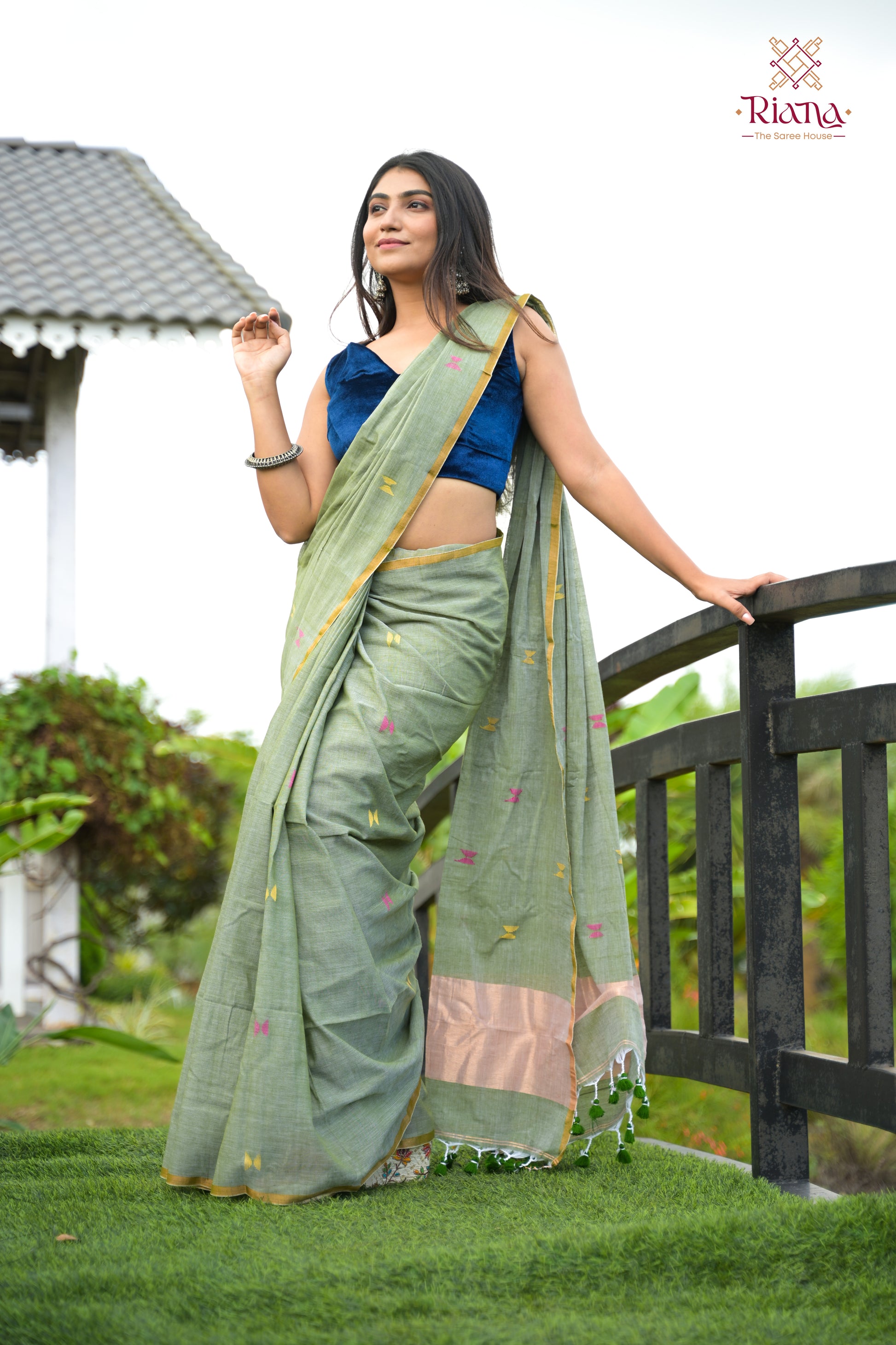 A sea green cotton saree that wraps you in the peace of unspoken moments. Like morning light on calm waters, it carries the tenderness of memories, the warmth of silence, and the comfort of simply being.