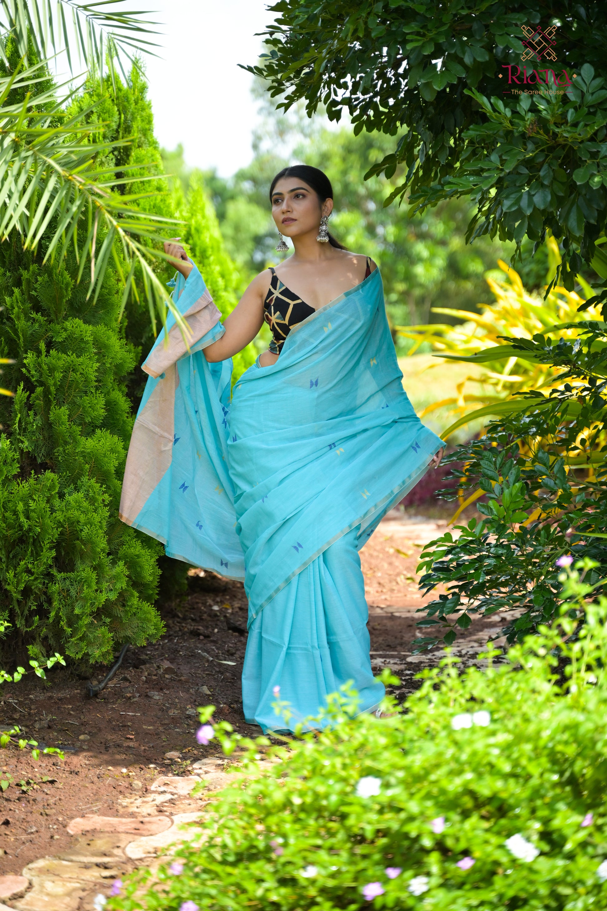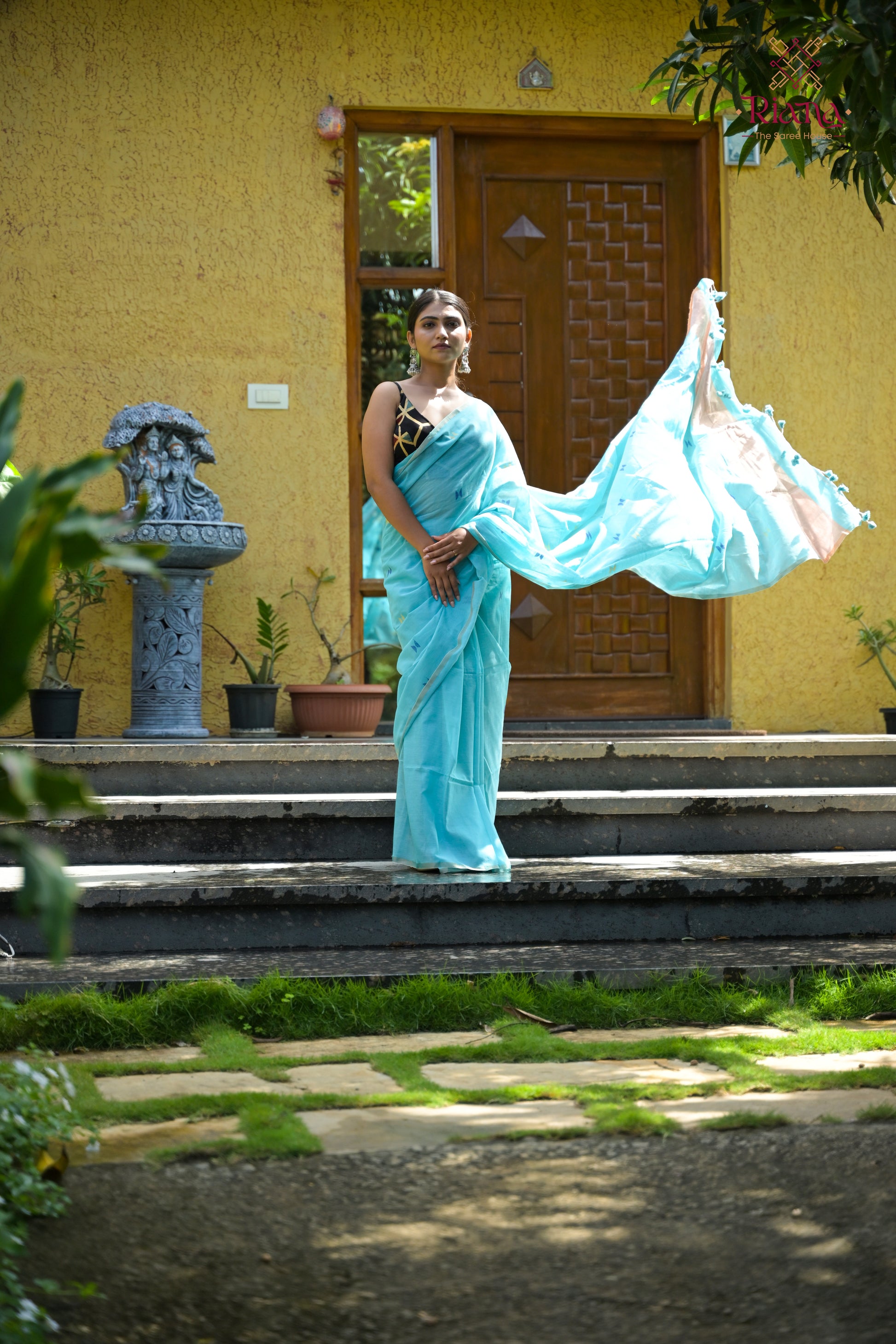 A soft sky blue cotton saree that feels like the first breeze of dawn touching your skin. Light as a whispered hope, it carries the innocence of new beginnings and the serenity of open skies.