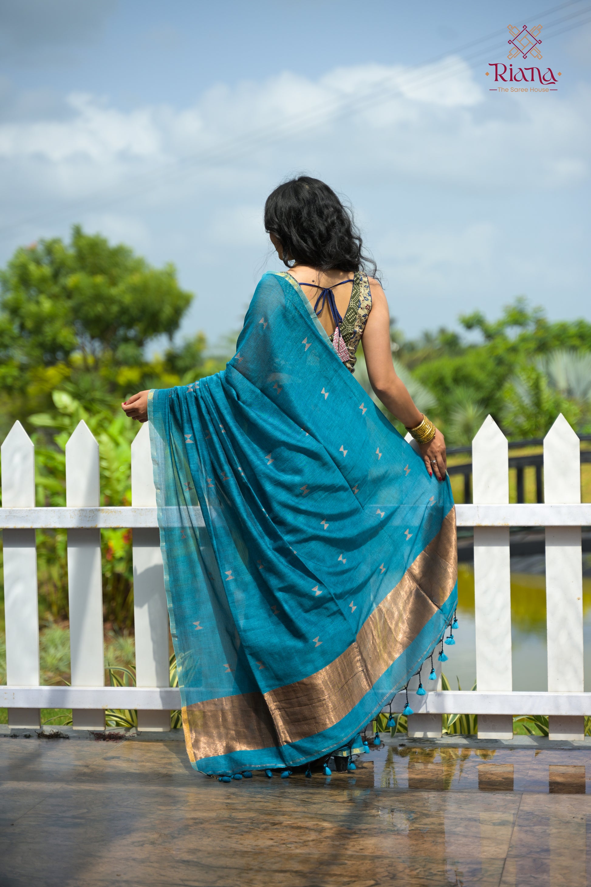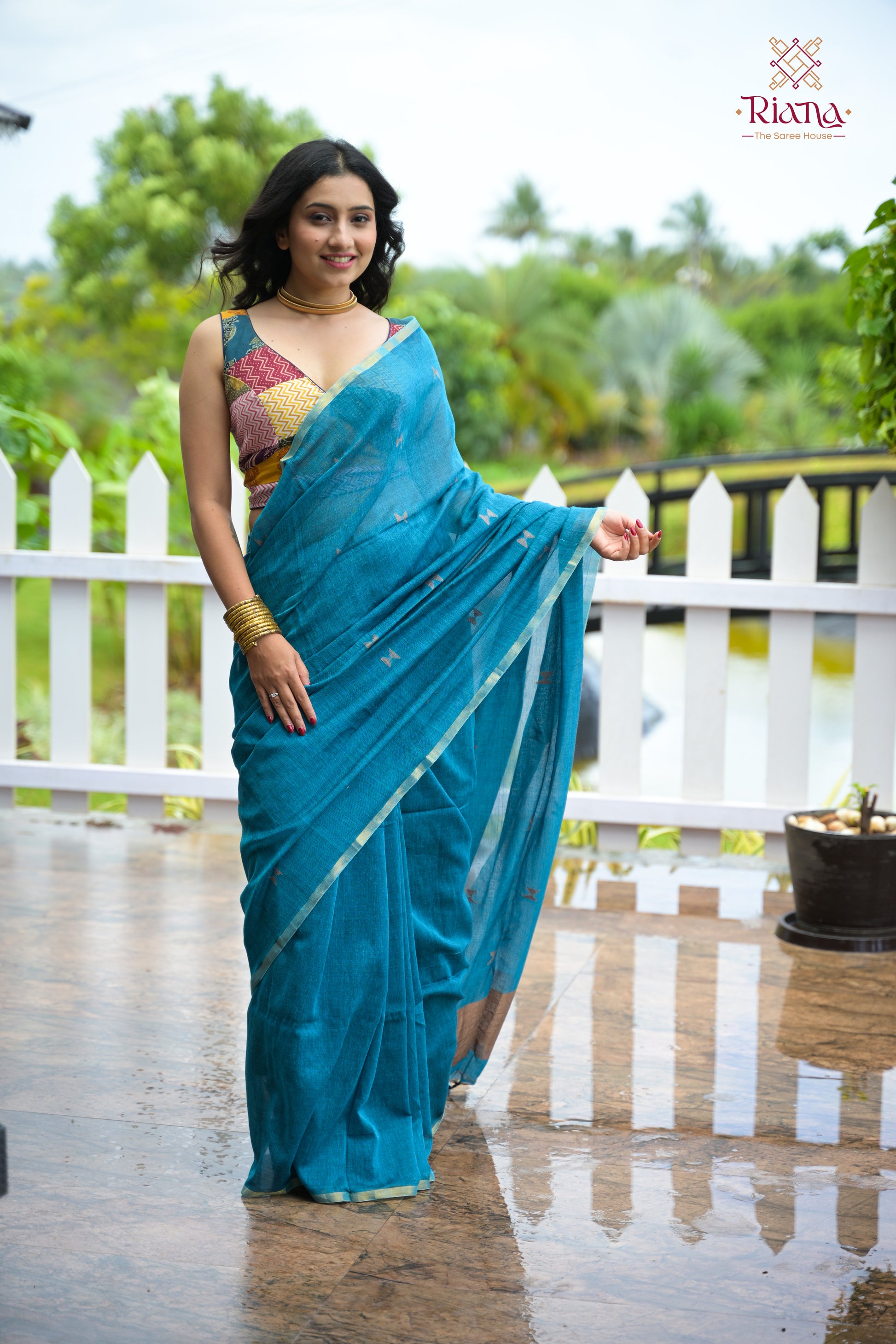 A blue cotton saree that feels like a quiet whisper of nostalgia. It flows with the depth of longing, wrapping you in dreams, distant skies, and the poetry of the unseen.