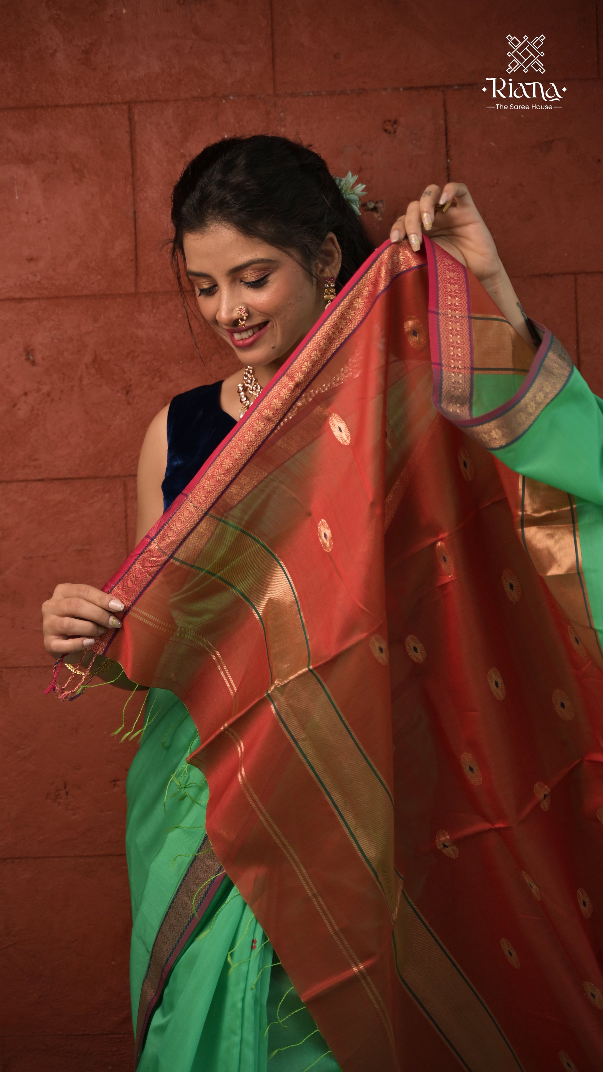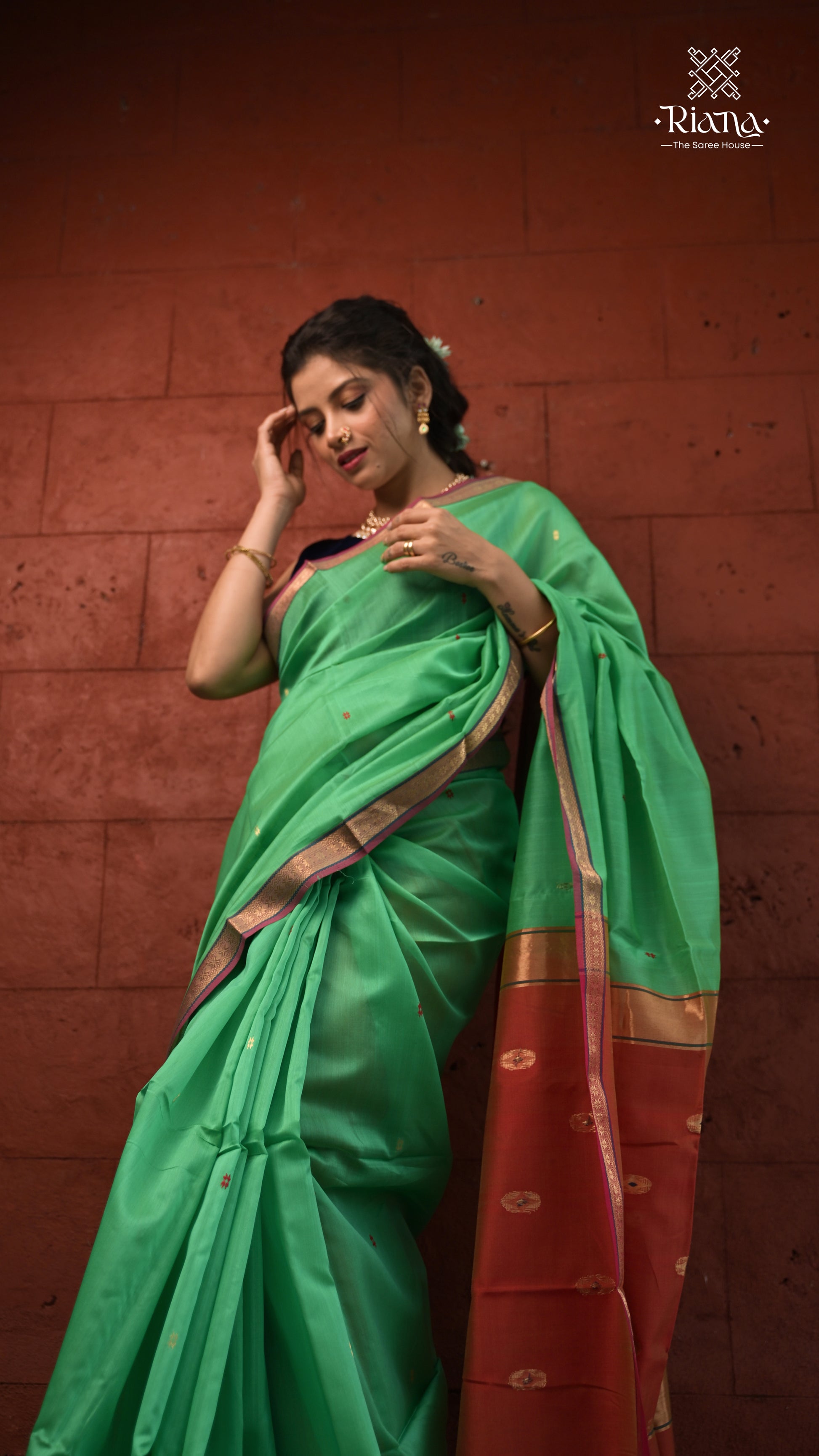 Fresh and graceful, Mrinal is a Maheshwari Mina Butta Handwoven