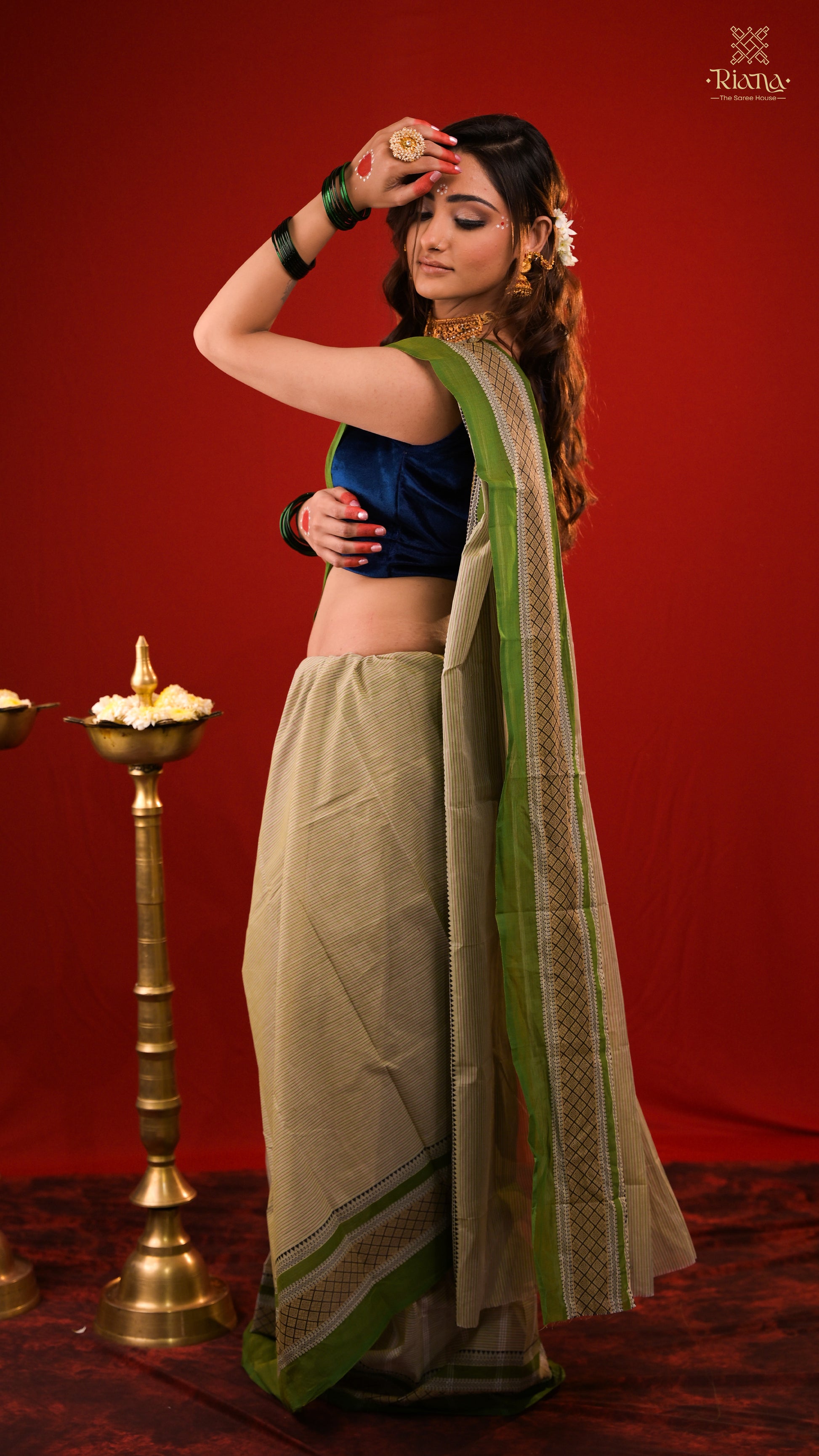 The temple design pallu is intricately woven, reflecting timeless artistry and cultural richness.