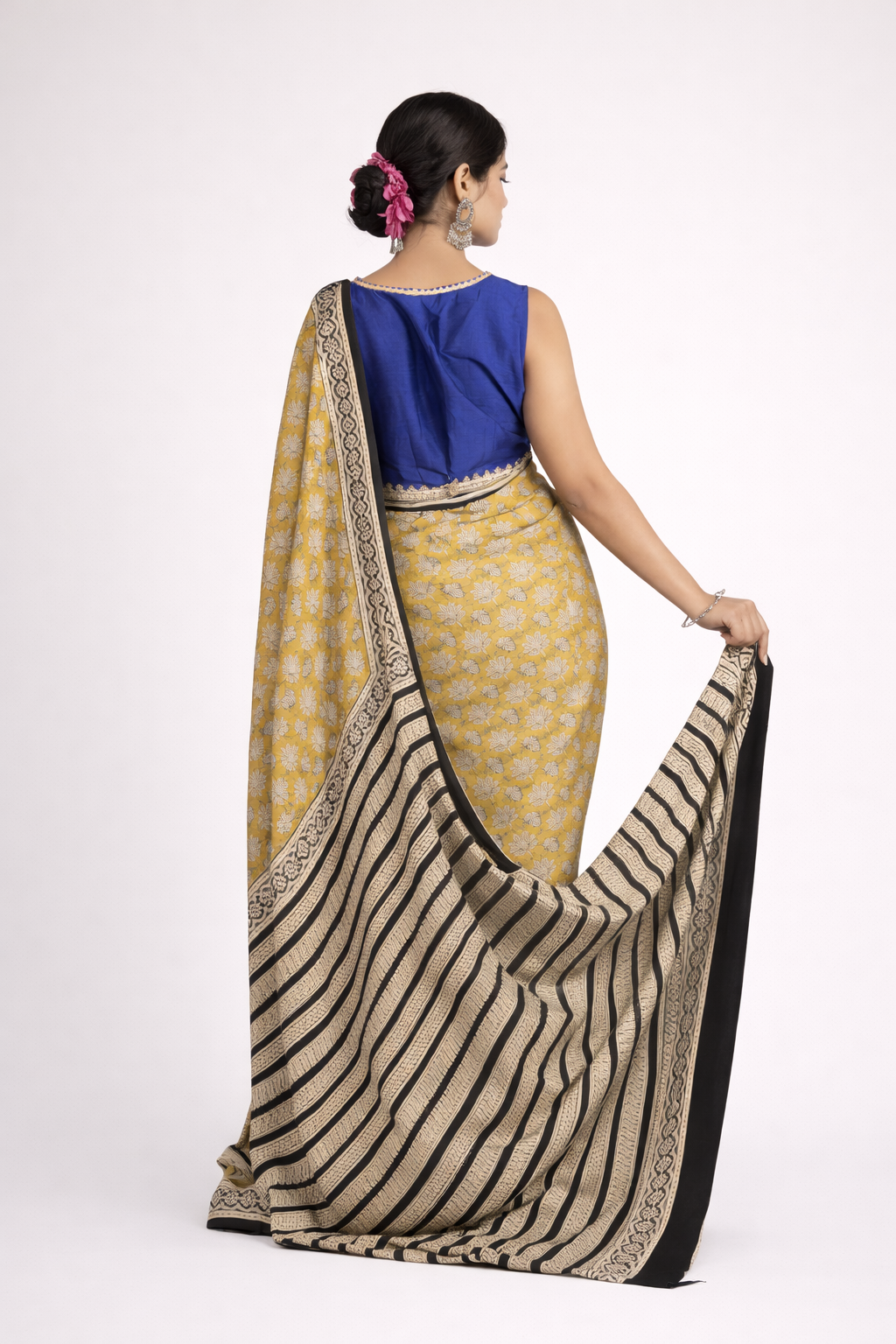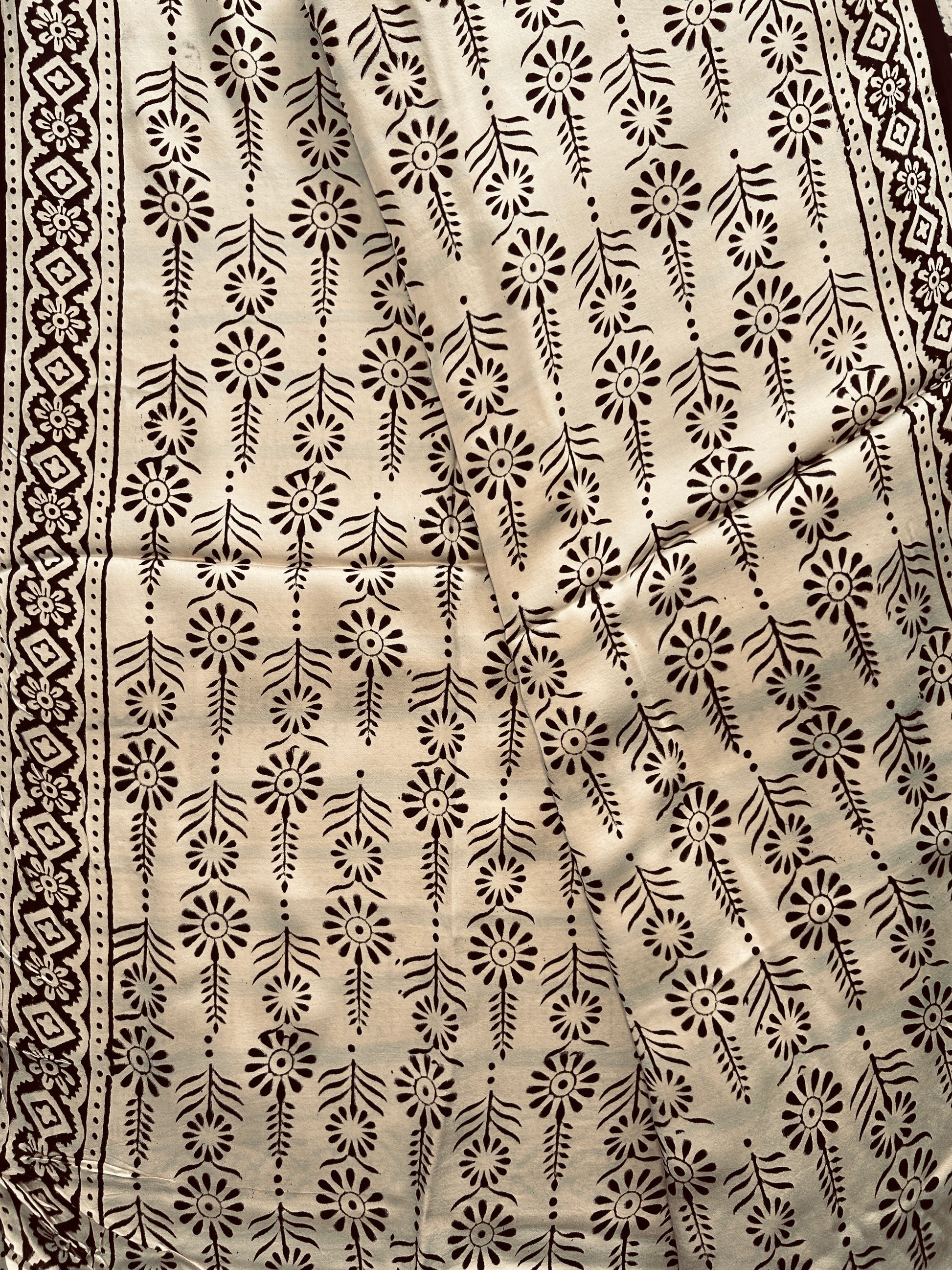 Indulge in the luxury of our Modal Silk Handprinted Ajrakh Saree, crafted with natural dyes. Each piece features intricate Ajrakh patterns, showcasing traditional artistry. The soft, lustrous modal silk drapes beautifully, making it perfect for any occasion. Embrace timeless elegance with this eco-friendly, handcrafted masterpiece.