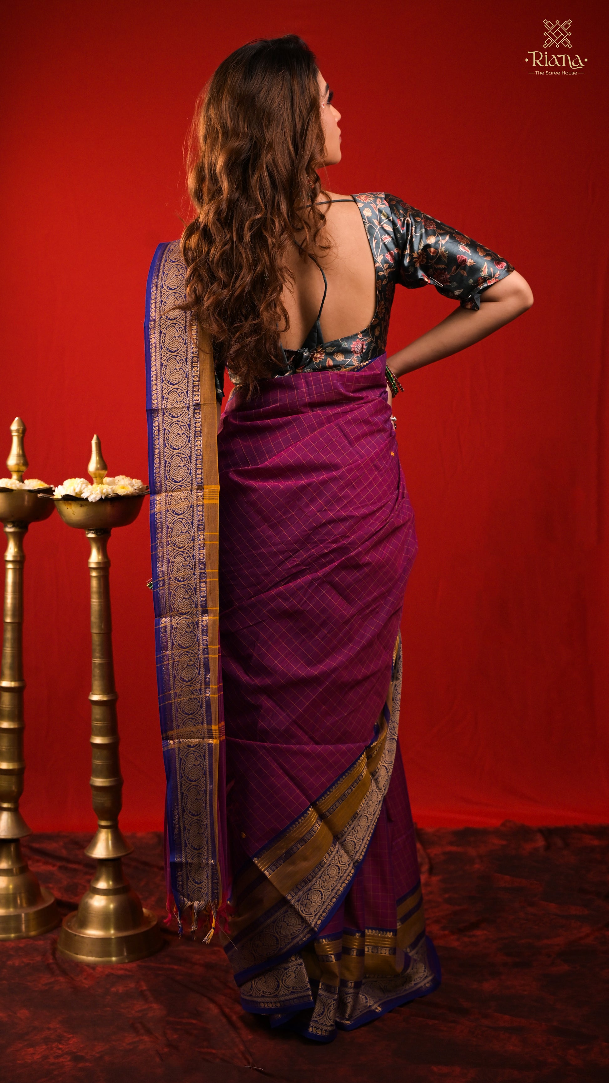 A dark Kanchipuram saree adorned with golden motifs and a richly woven pallu, crafted to exude festive elegance. A true heirloom, it is perfect for weddings, grand celebrations, and timeless collections.