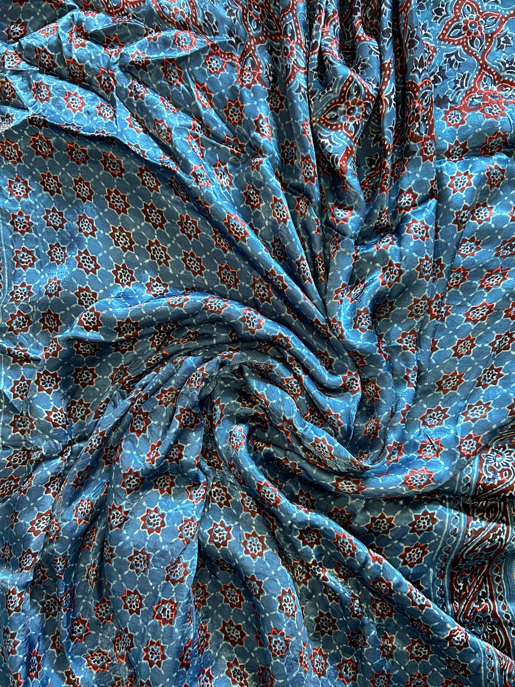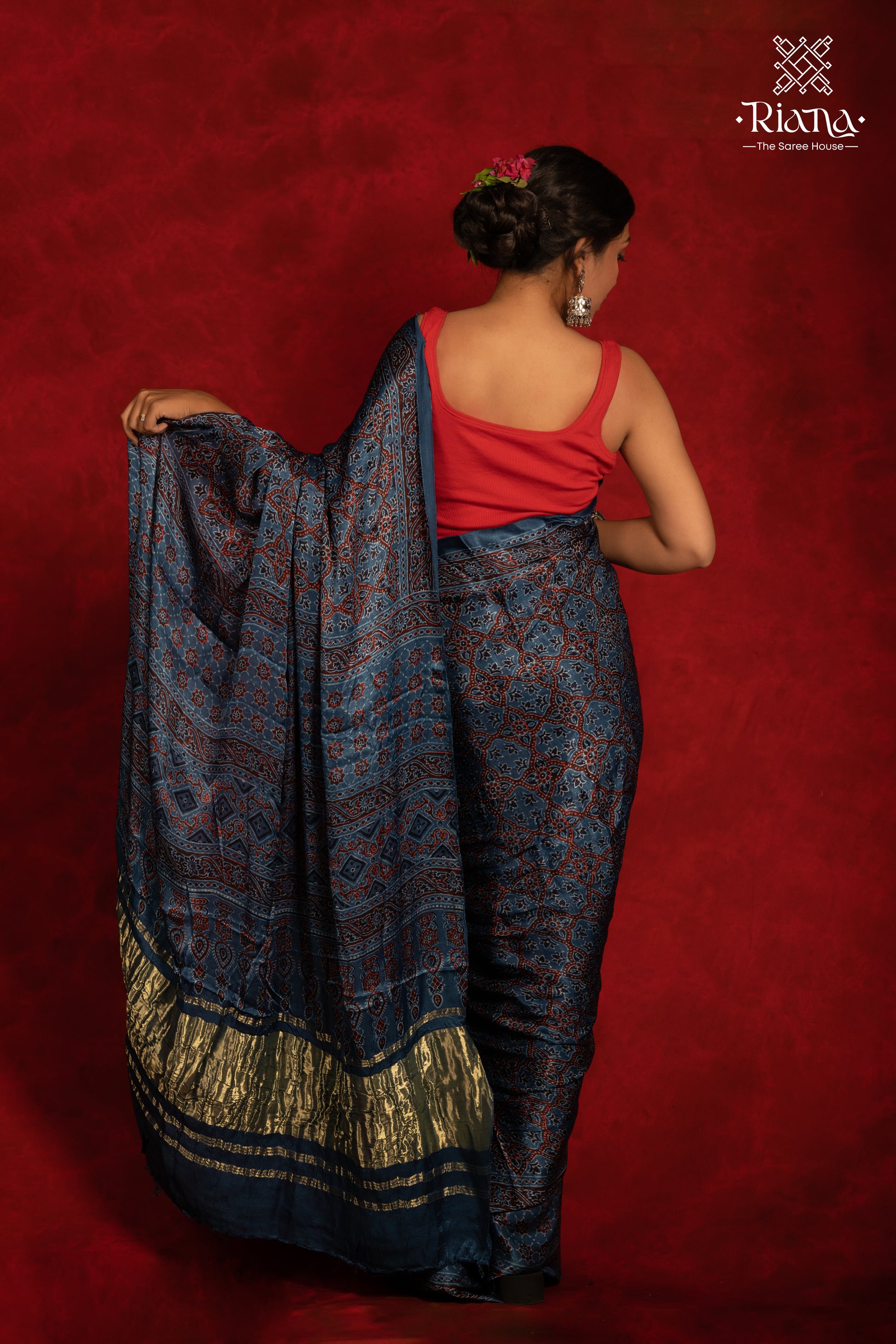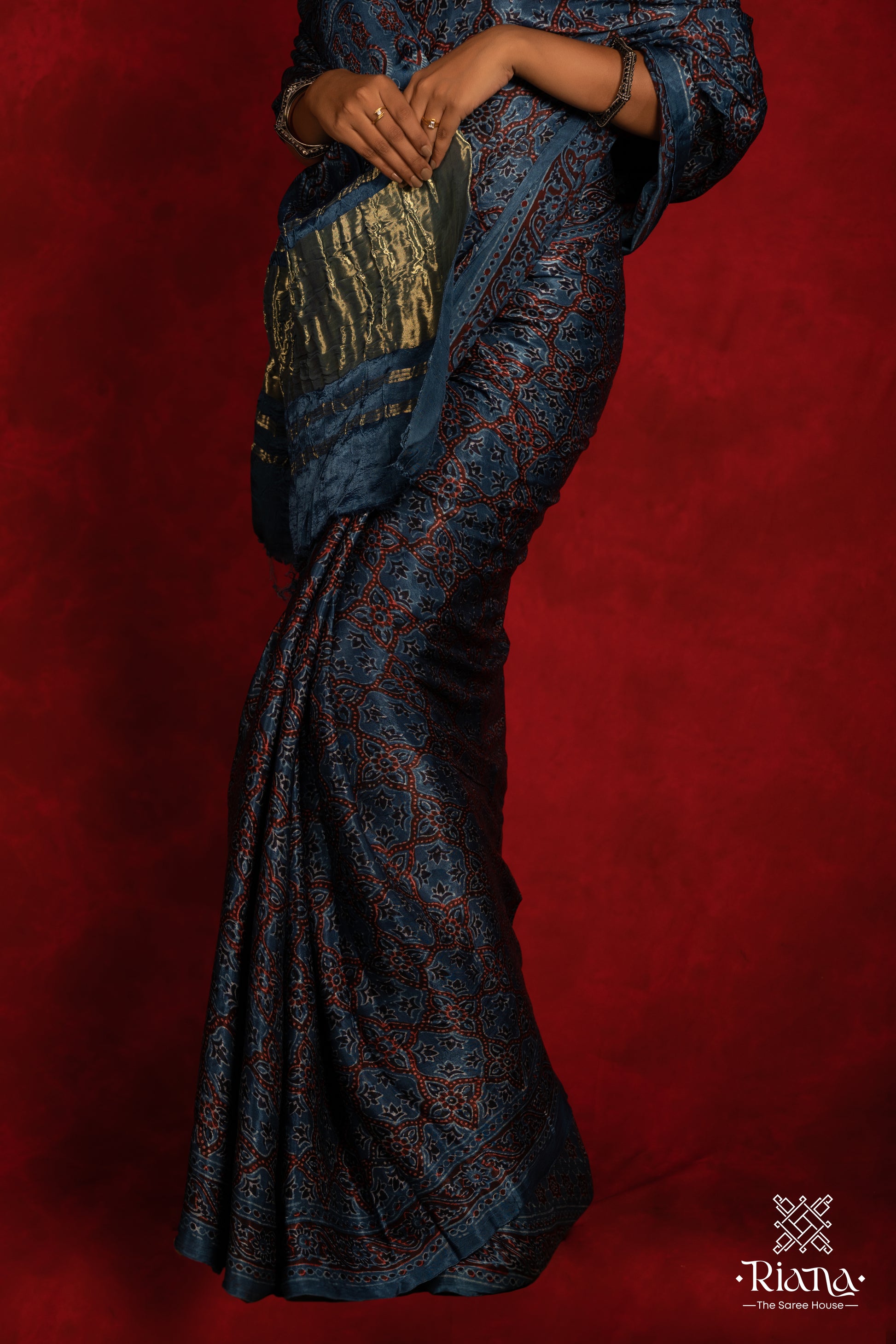Indulge in the luxury of our Modal Silk Handprinted Ajrakh Saree, crafted with natural dyes. Each piece features intricate Ajrakh patterns, showcasing traditional artistry. The soft, lustrous modal silk drapes beautifully, making it perfect for any occasion. Embrace timeless elegance with this eco-friendly, handcrafted masterpiece.