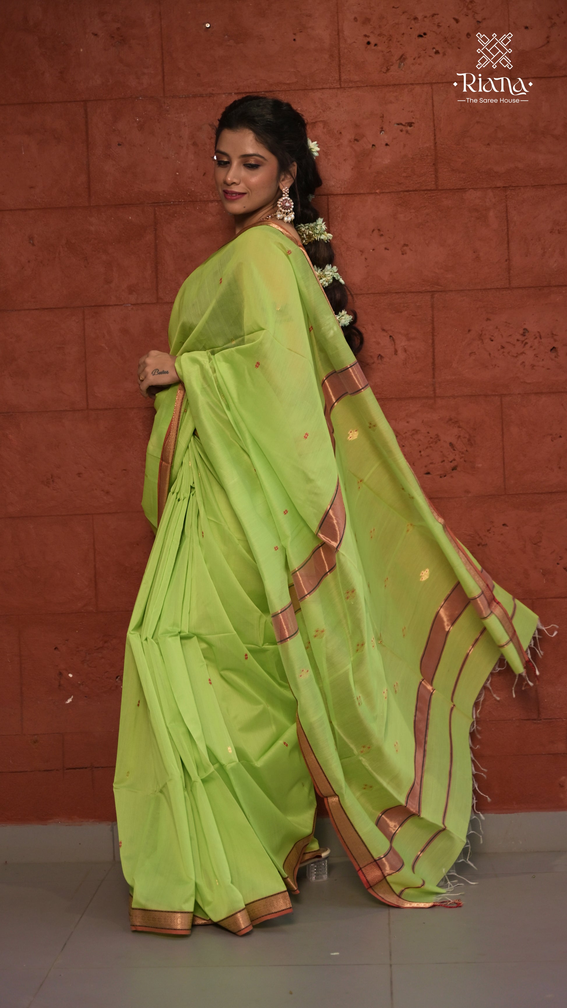 Rajvi is a Maheshwari Mina Butta Handwoven Saree crafted to embody