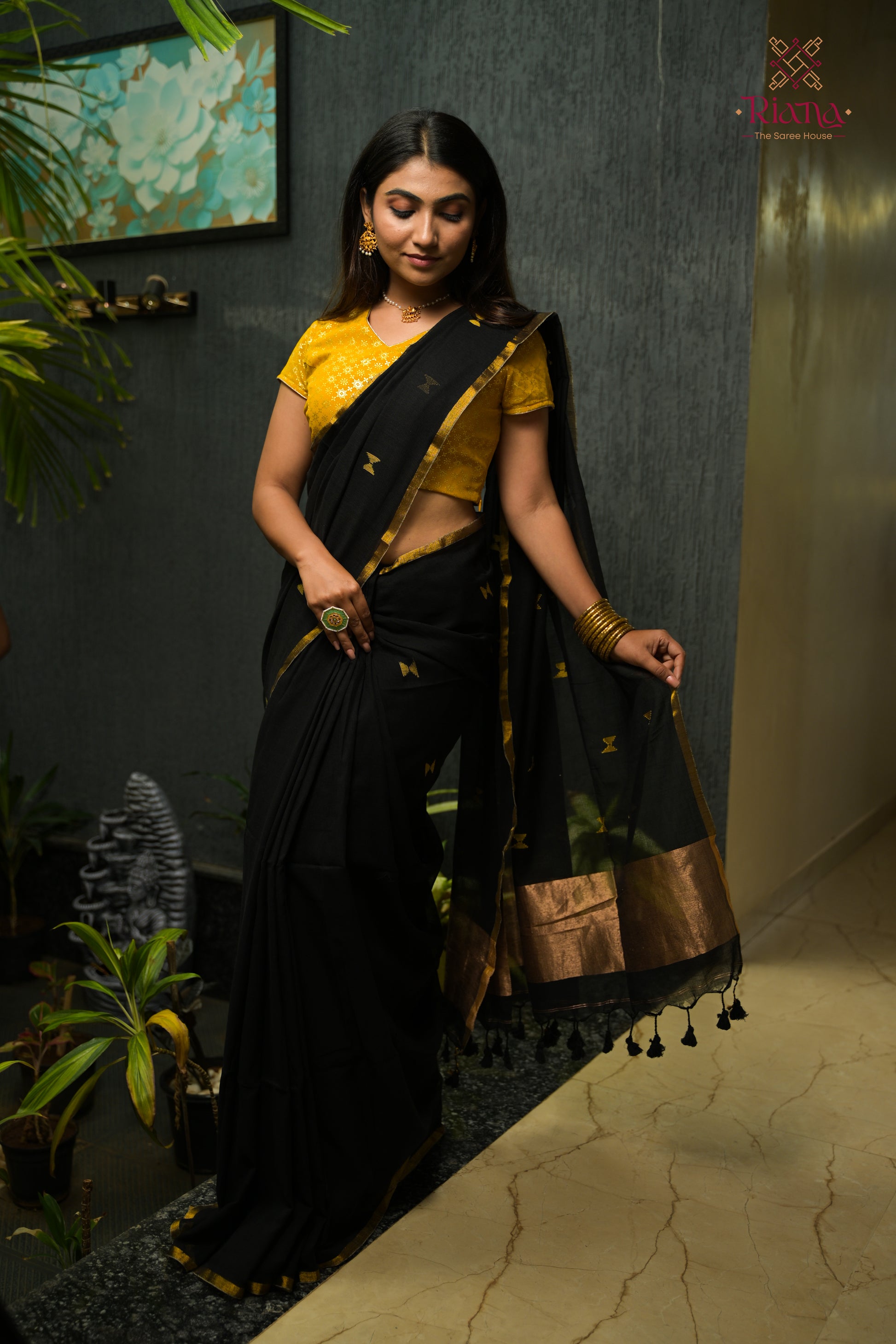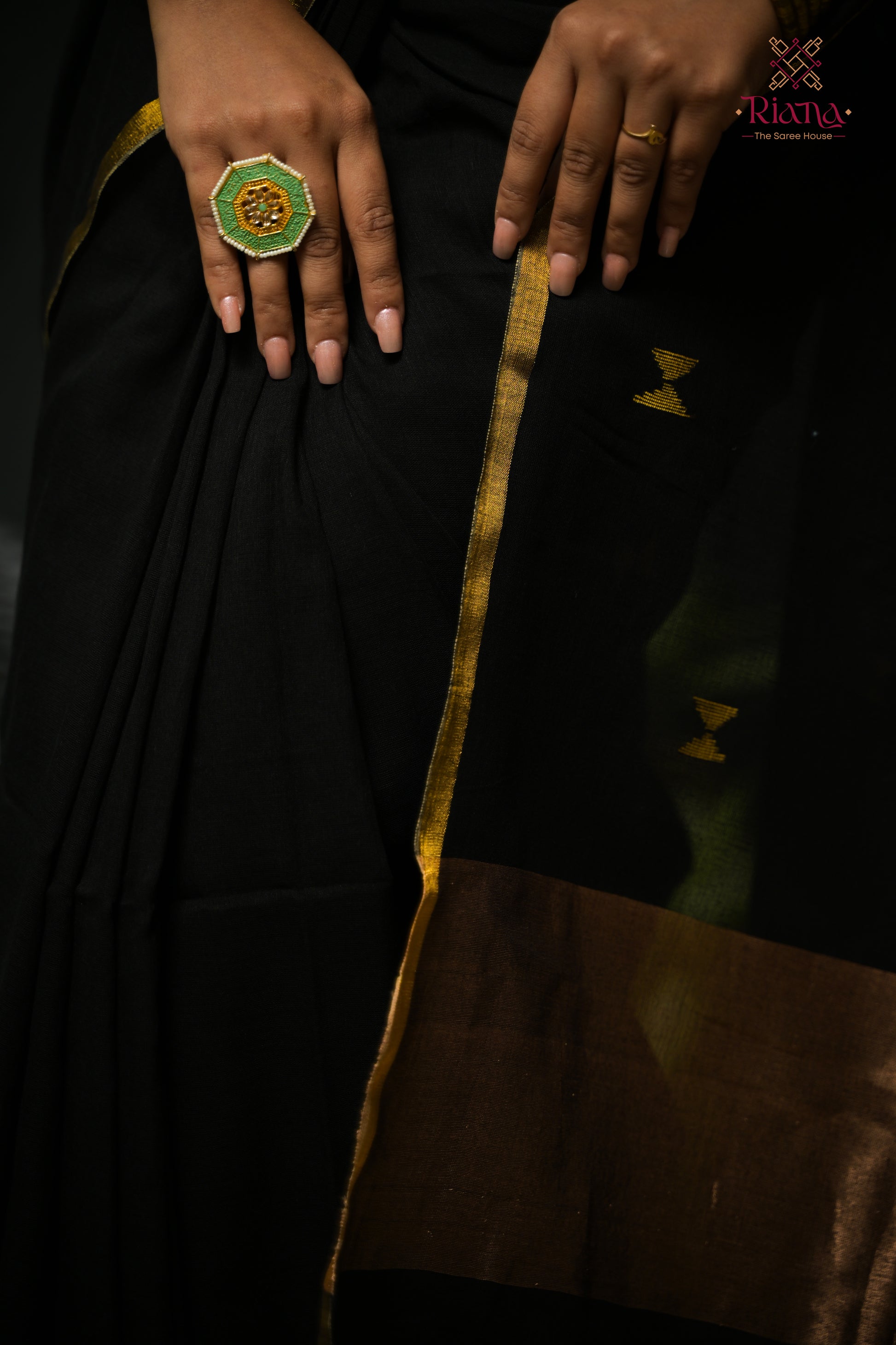 A black cotton saree adorned with golden motifs, bold yet poetic. It carries the grace of quiet strength, the allure of mystery, and the timeless elegance of a woman who owns her silence and her shine.