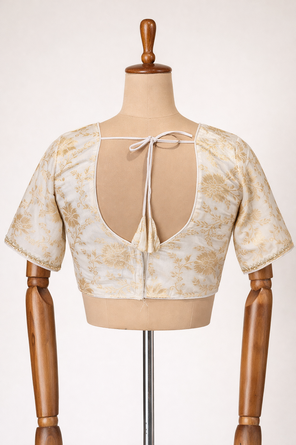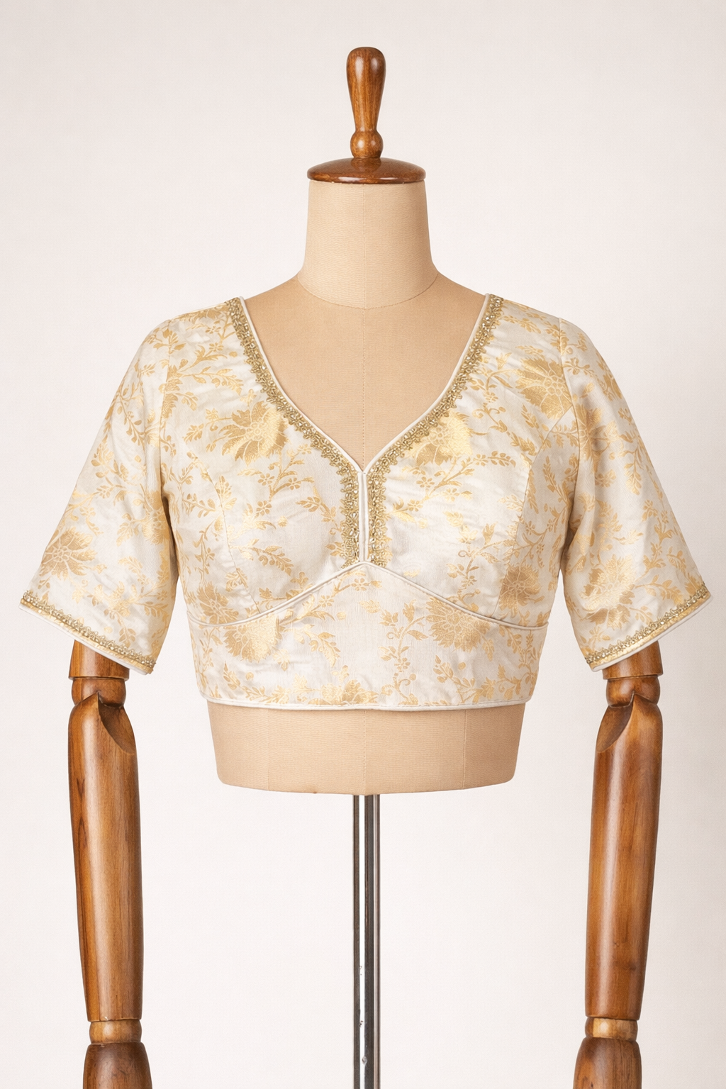 An elegant ivory blouse featuring subtle floral brocade detailing and a flattering V-neckline. Finished with delicate trims and a comfortable tailored fit, it pairs beautifully with both festive and classic sarees. Perfect for refined, timeless styling.