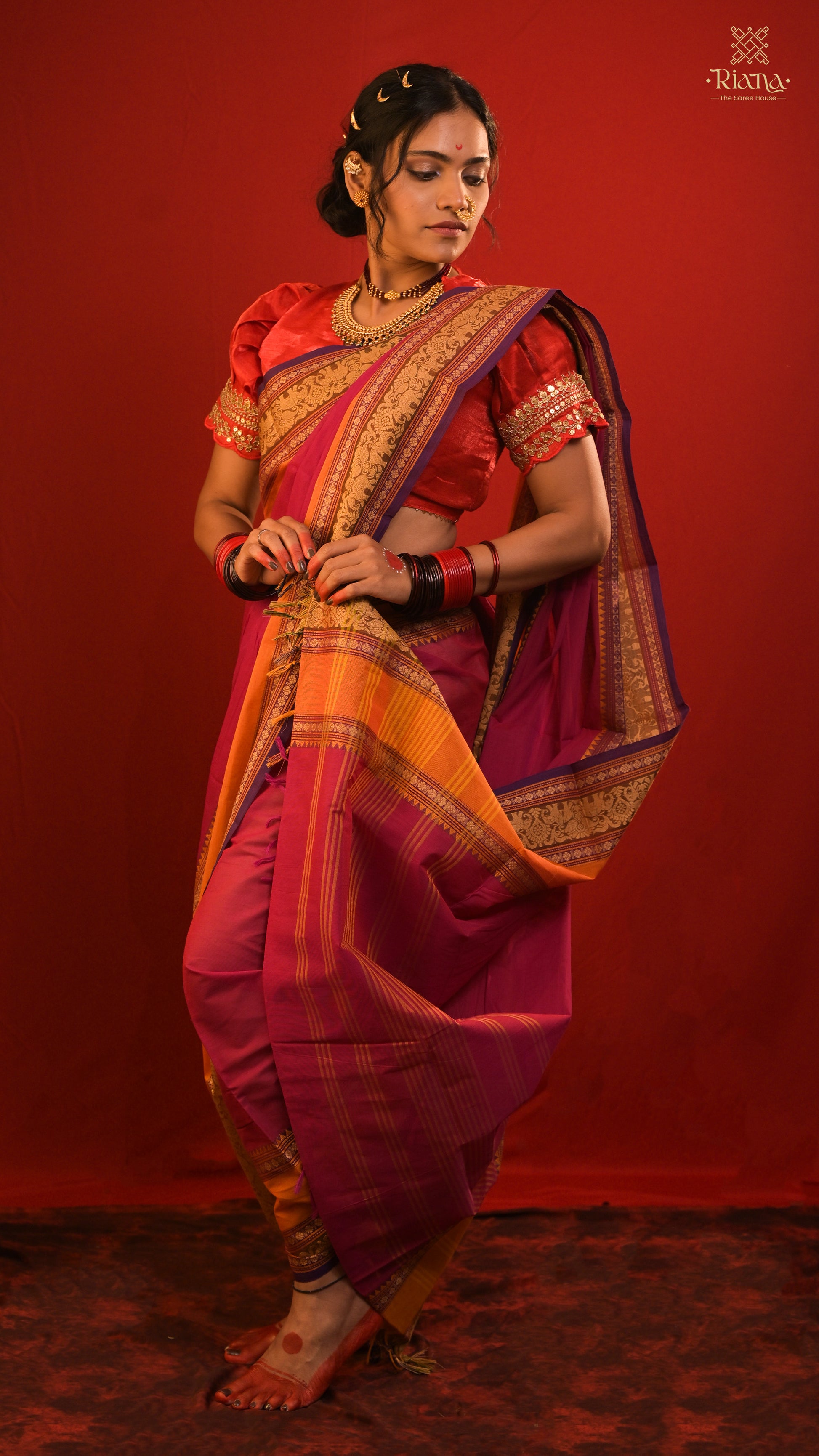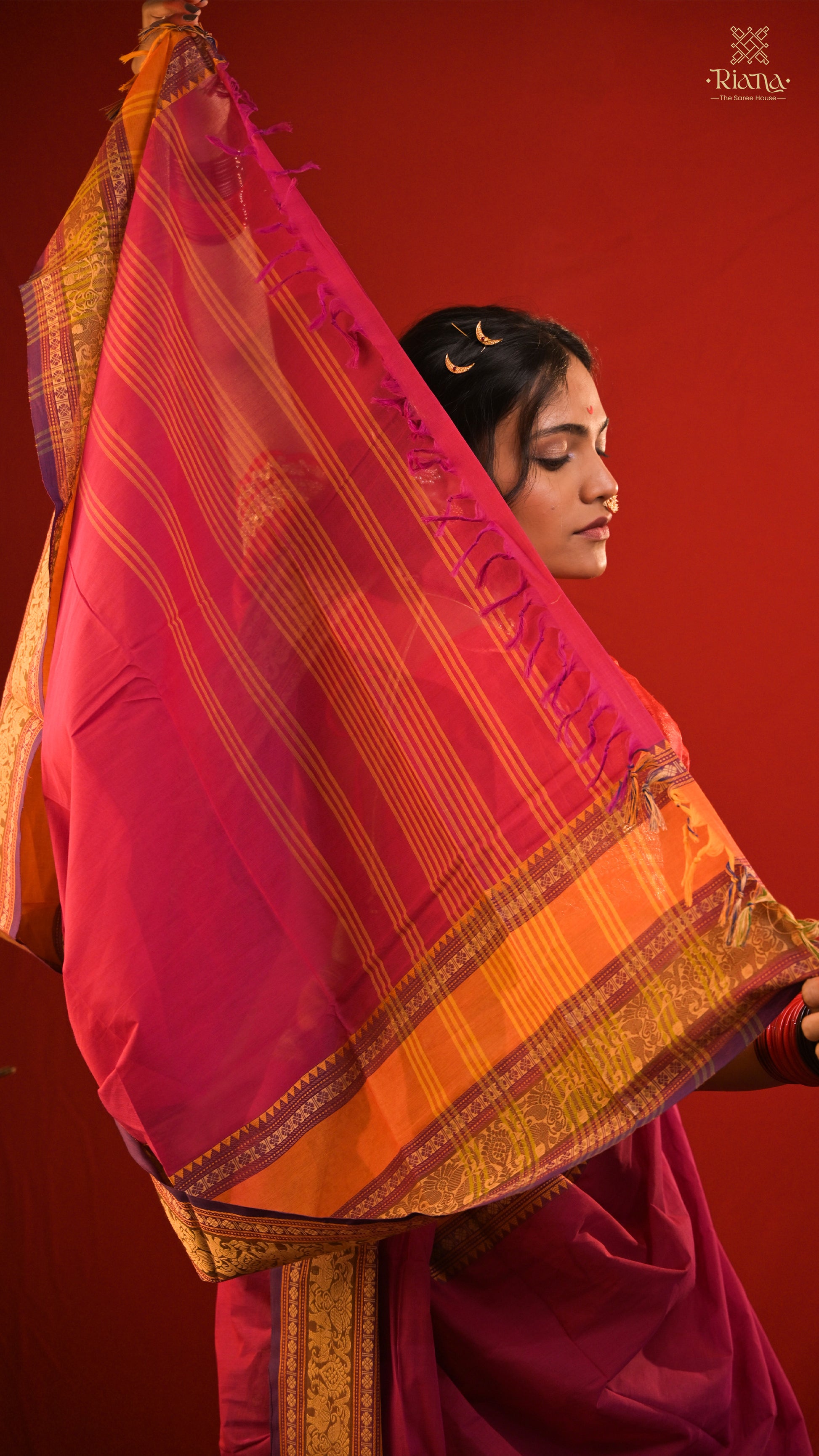 A striking handloom Kanchipuram saree, defined by its bold contrasting temple and shimmering zari borders. An heirloom of elegance, it captures the grandeur of festive tradition in every drape.