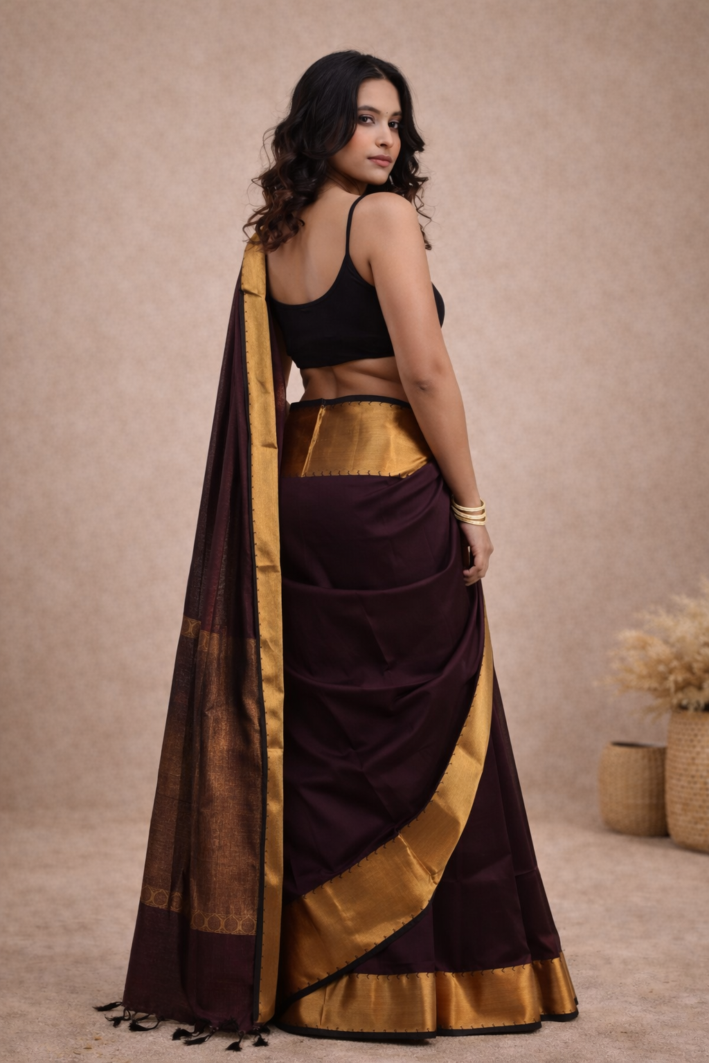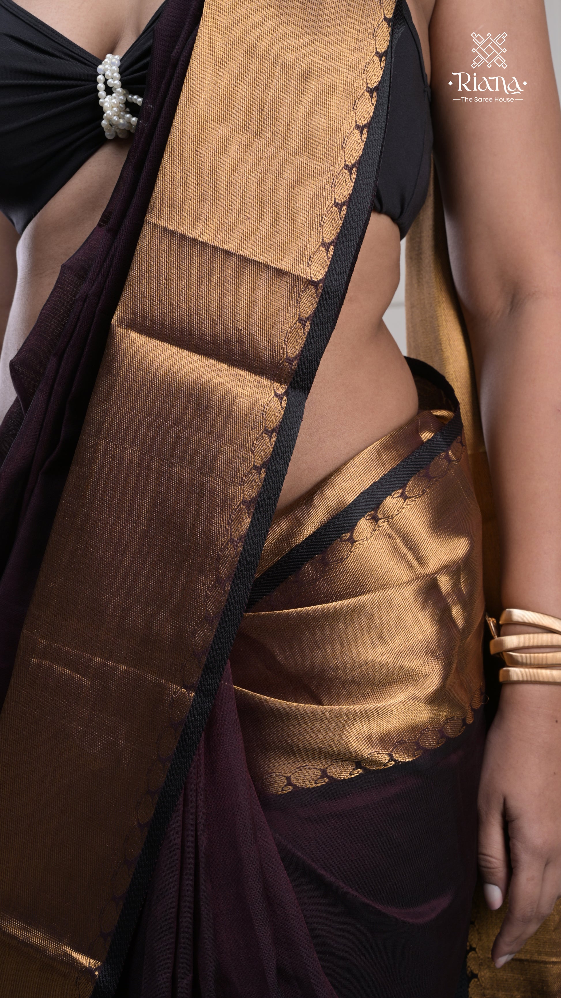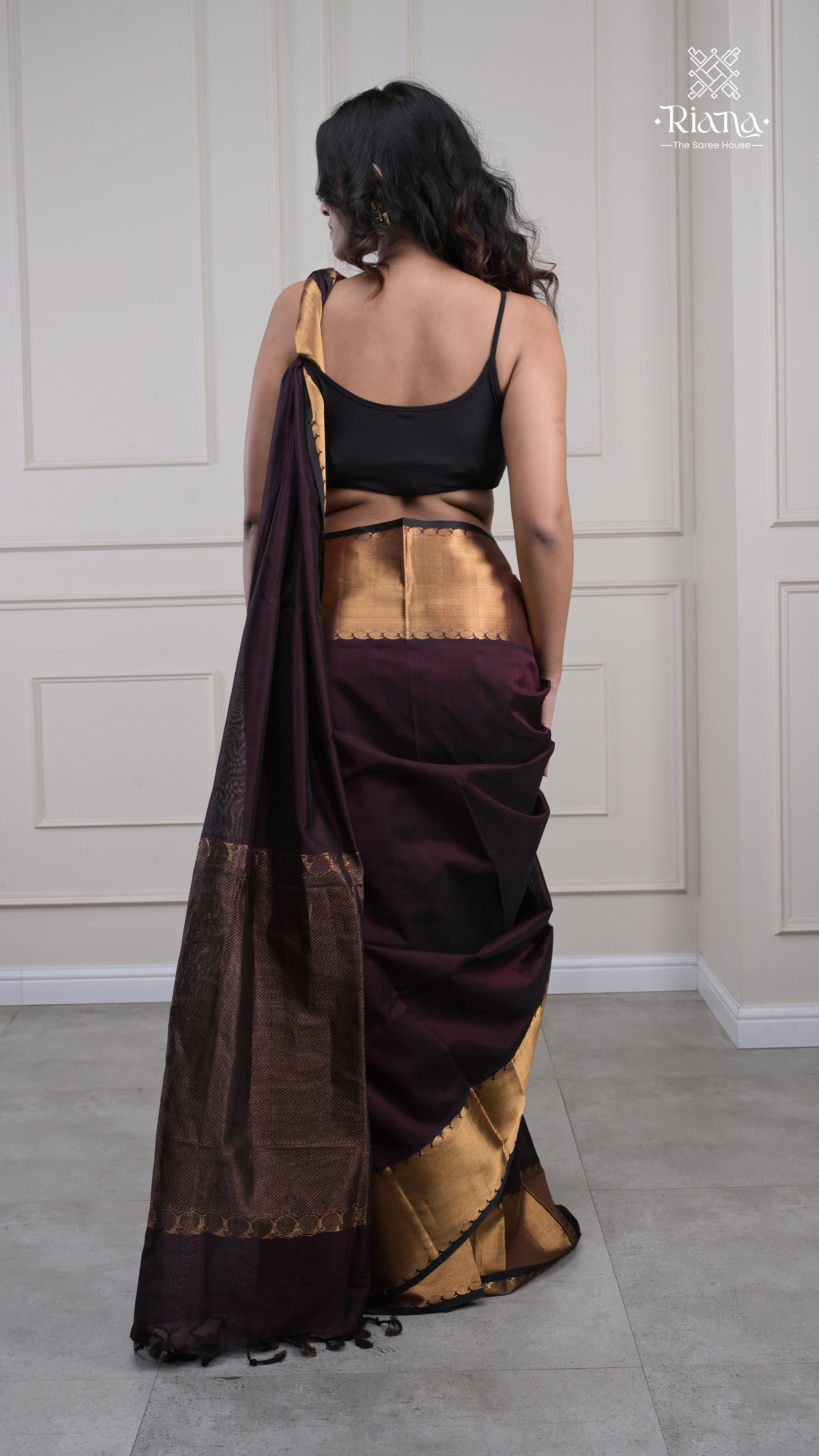 From the Rajam Collection, this dark-hued saree features a plain border delicately adorned with mango motifs, radiating understated festive elegance.