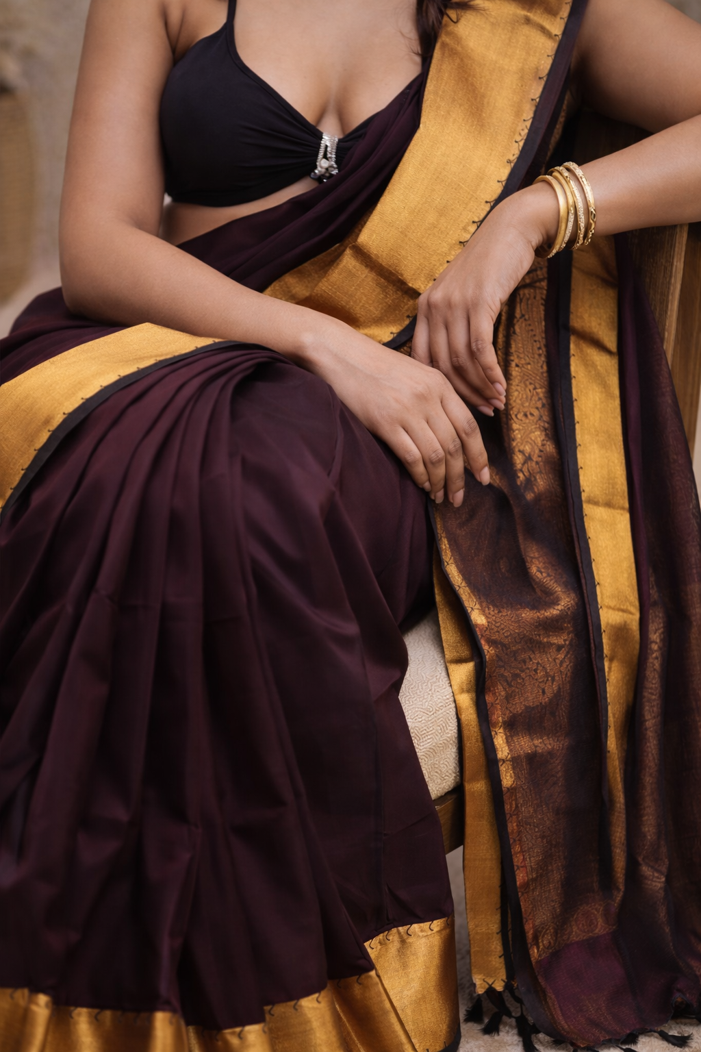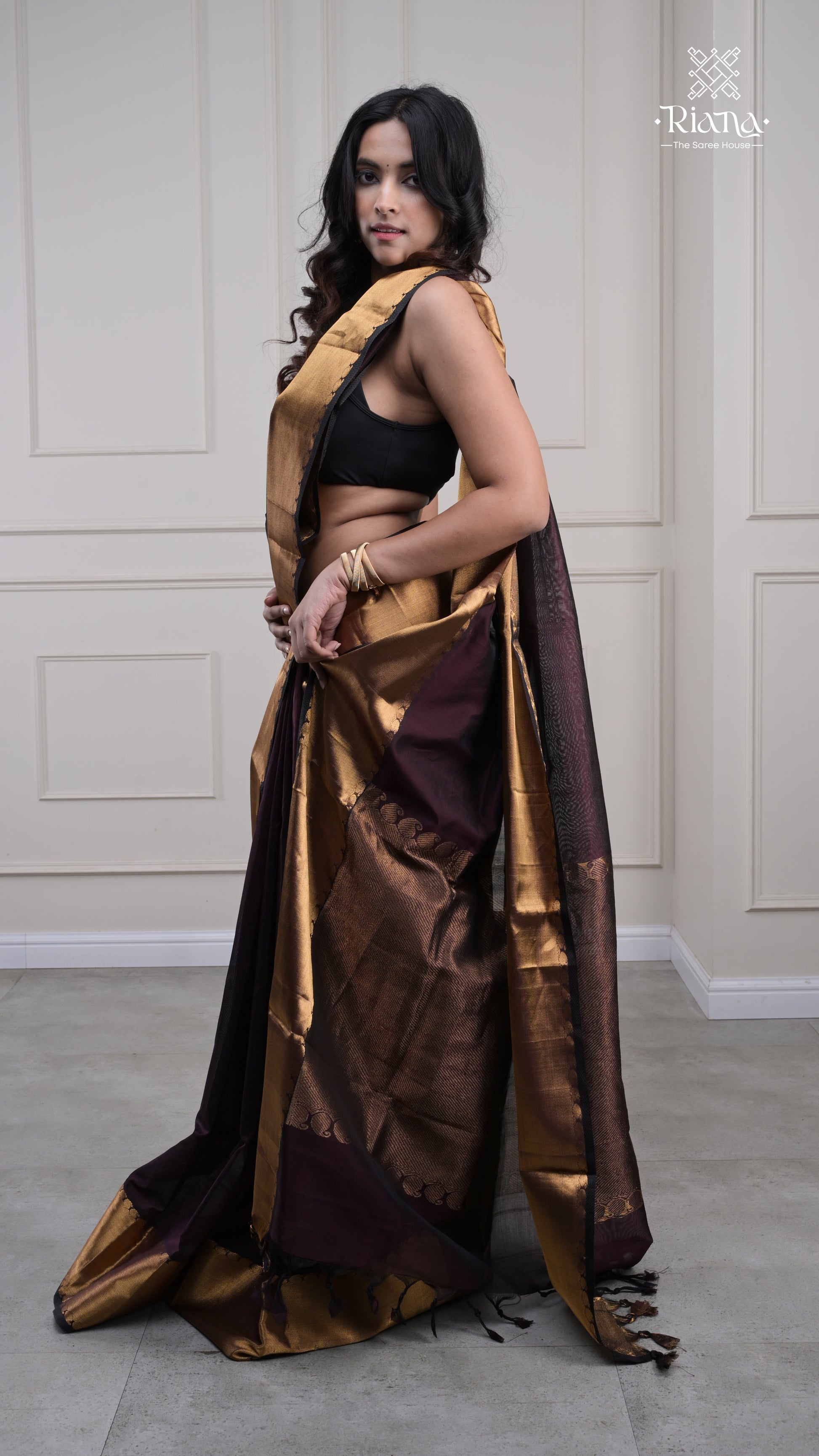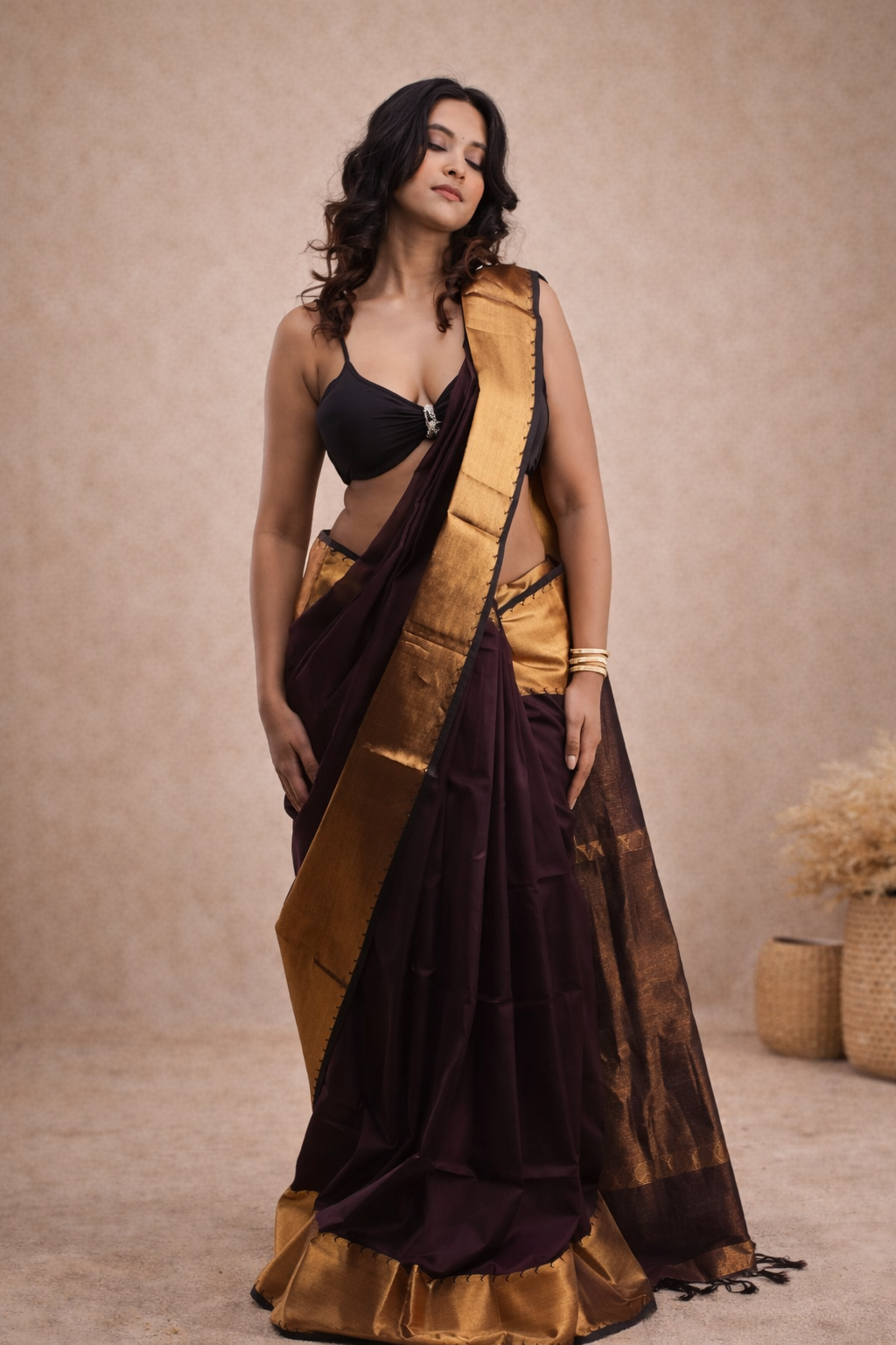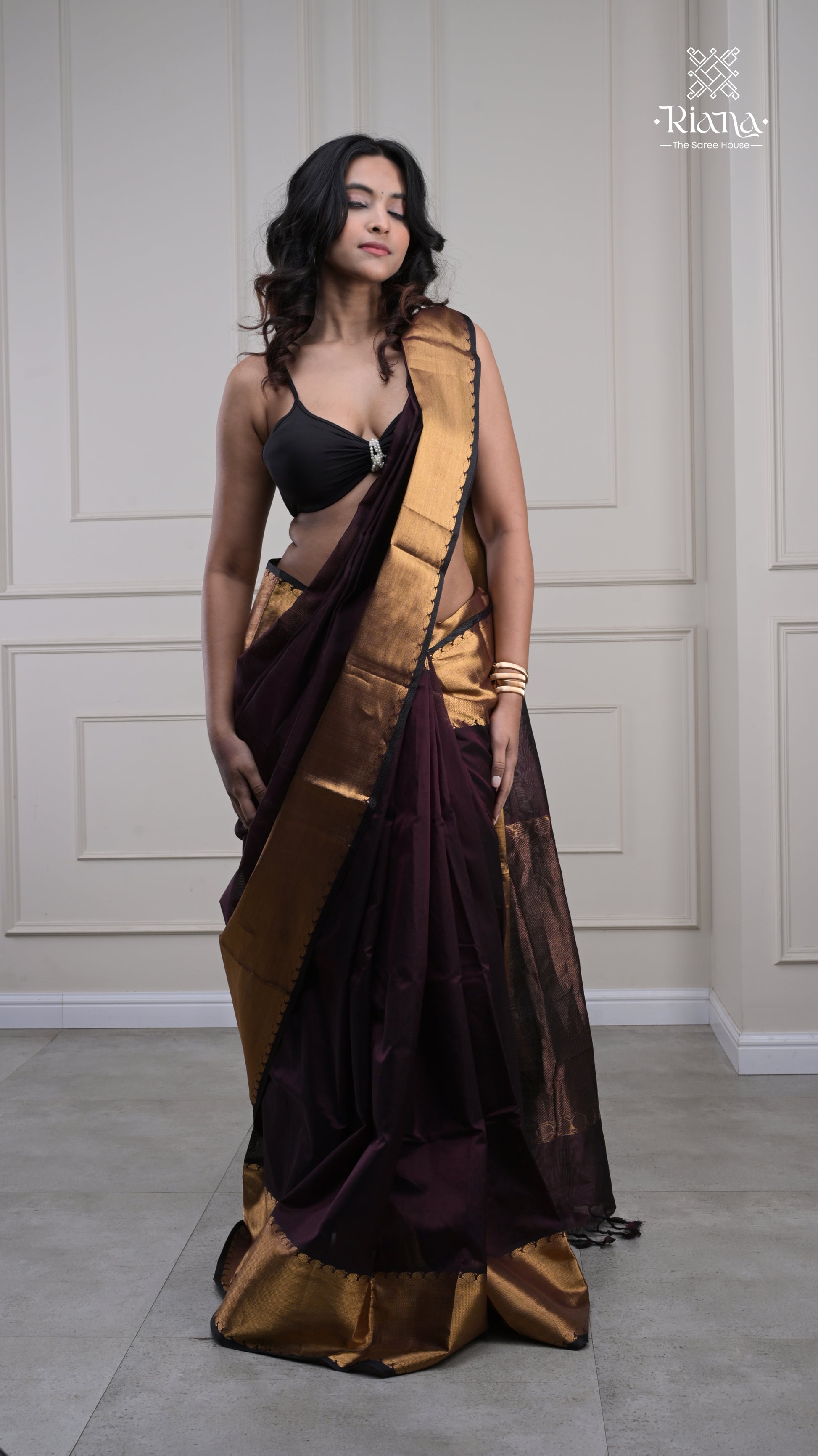 From the Rajam Collection, this dark-hued saree features a plain border delicately adorned with mango motifs, radiating understated festive elegance.