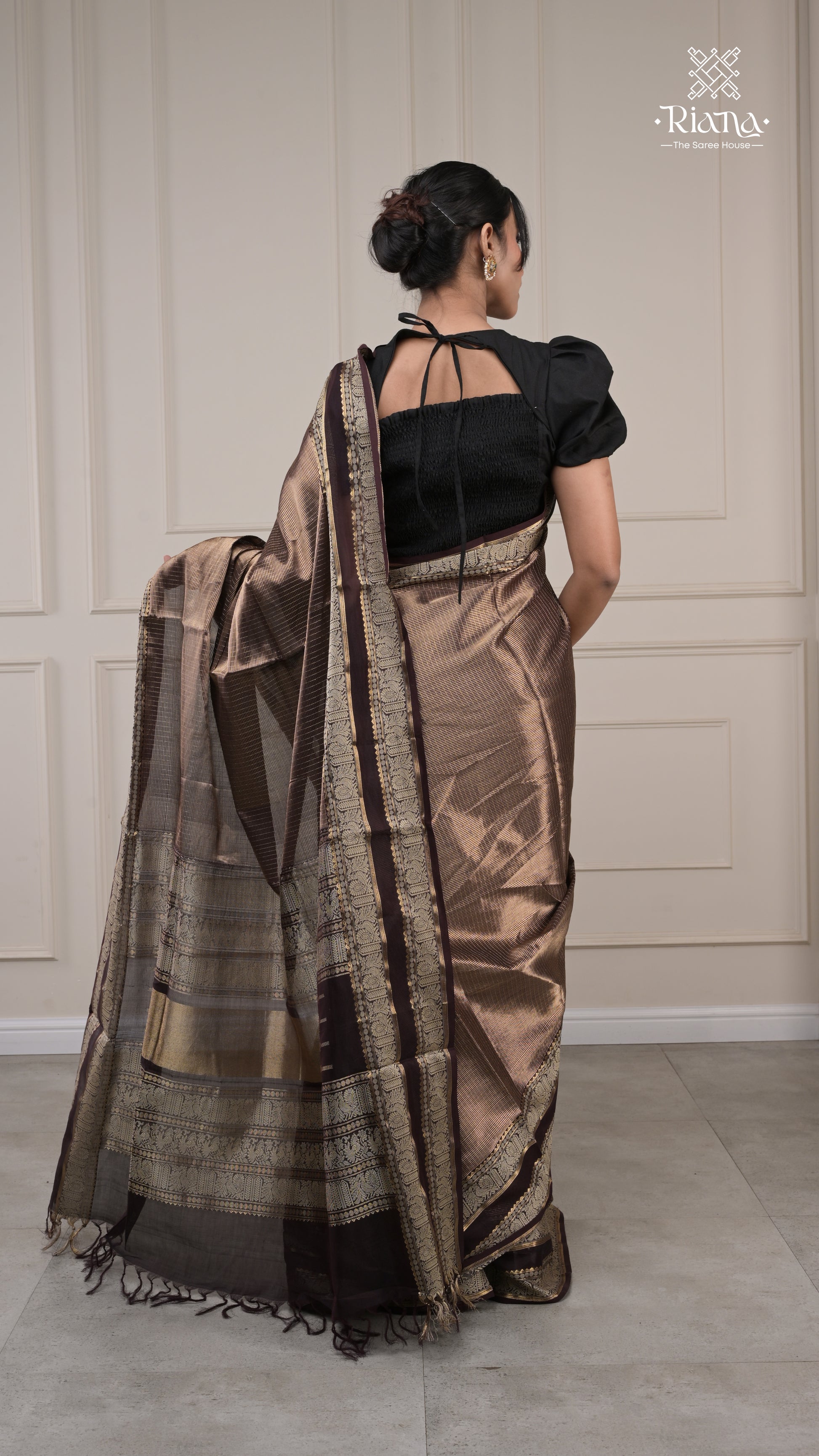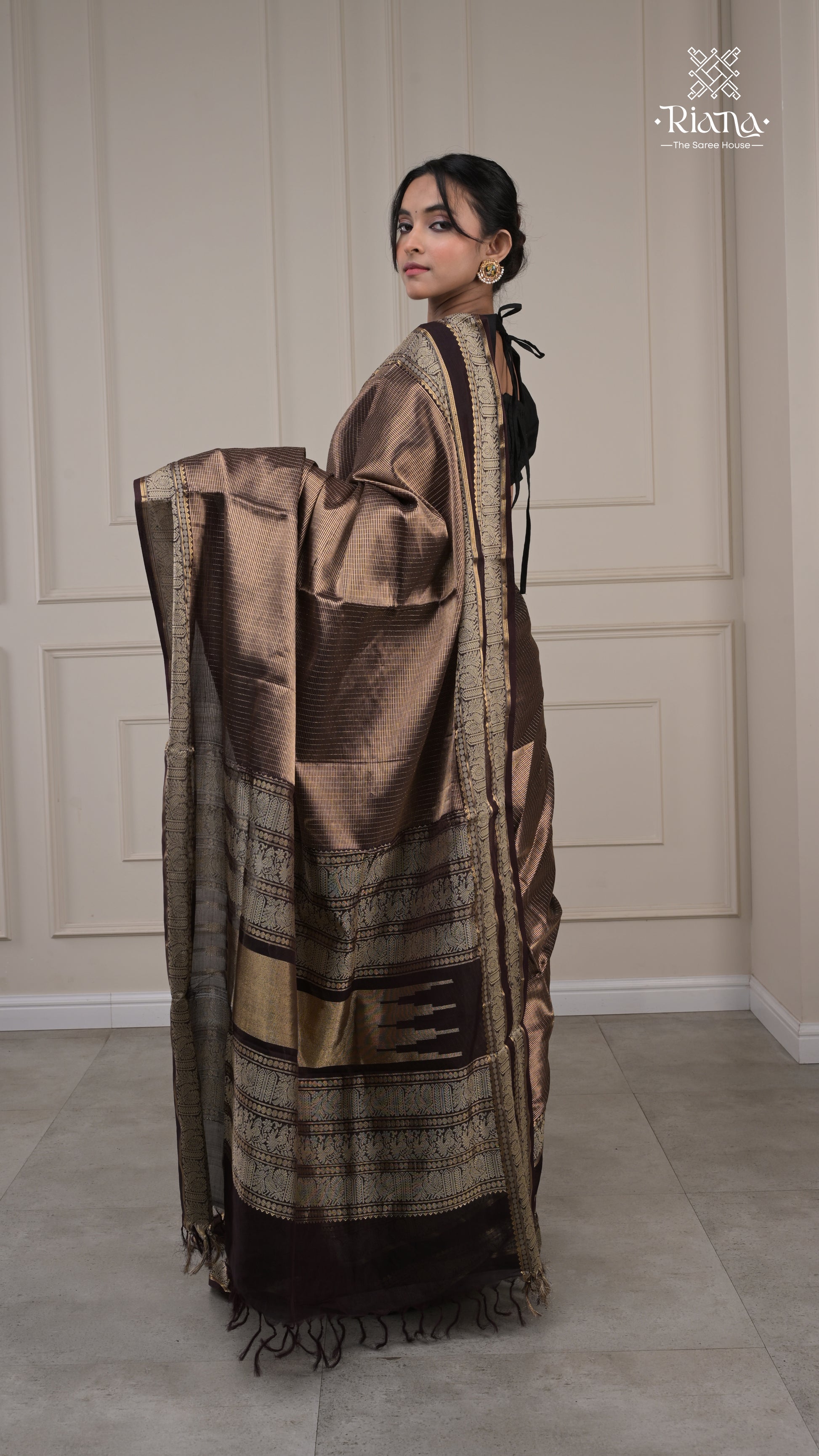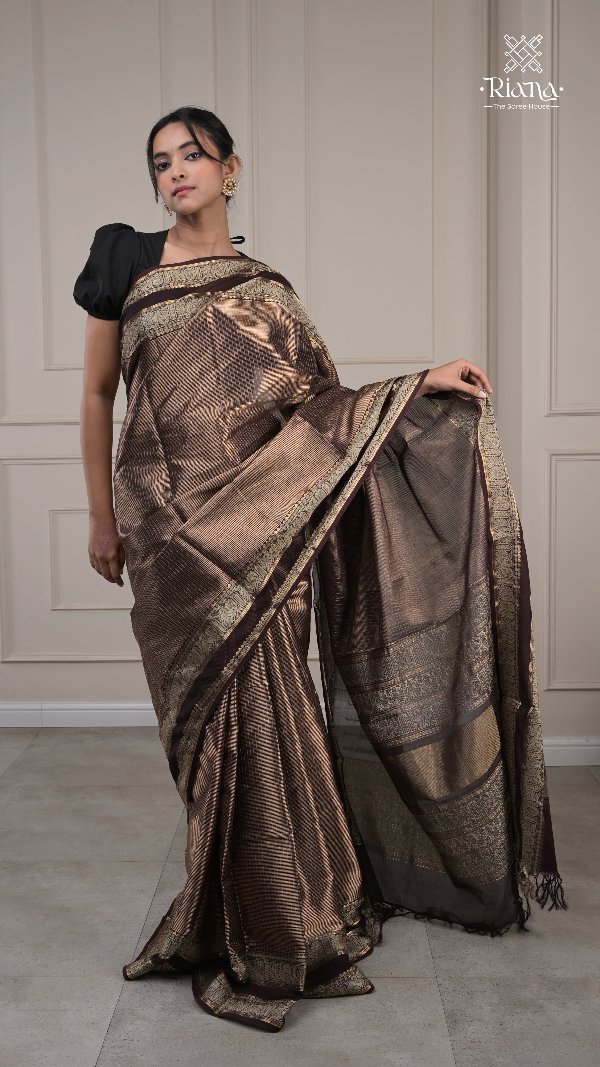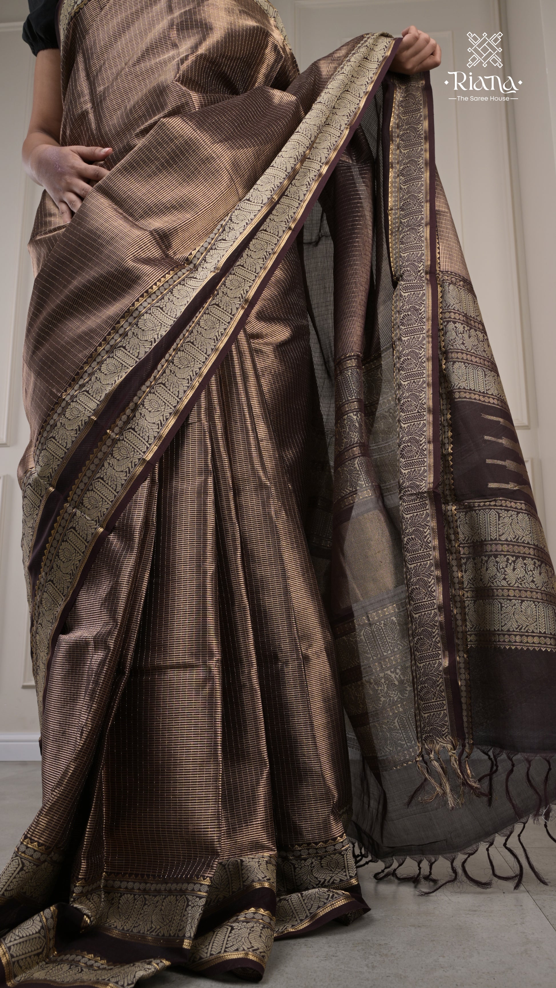 From the Rajam Collection, this saree features double borders adorned with peacock motifs and a subtle overall checks pattern, blending traditional charm with festive elegance.