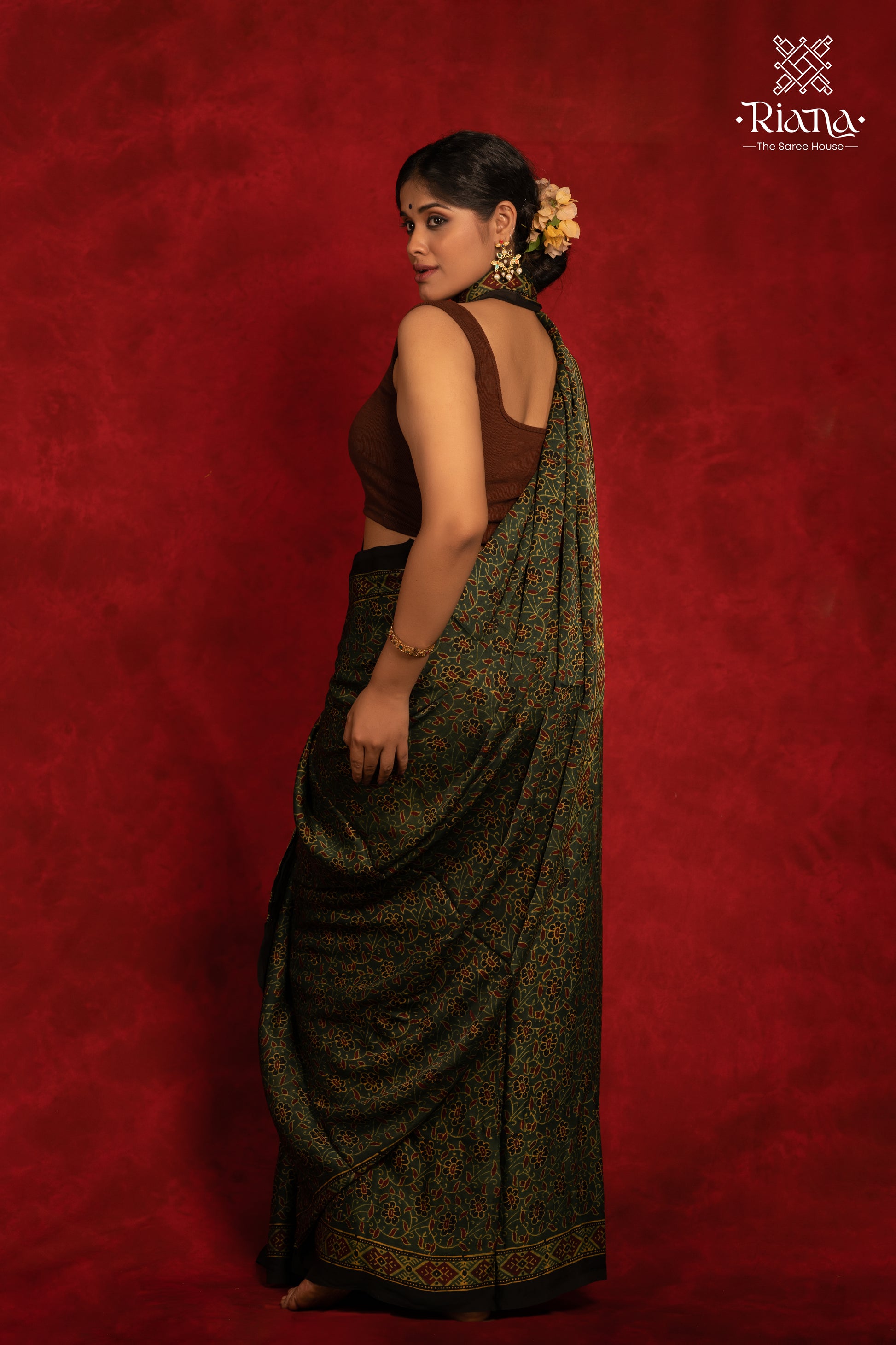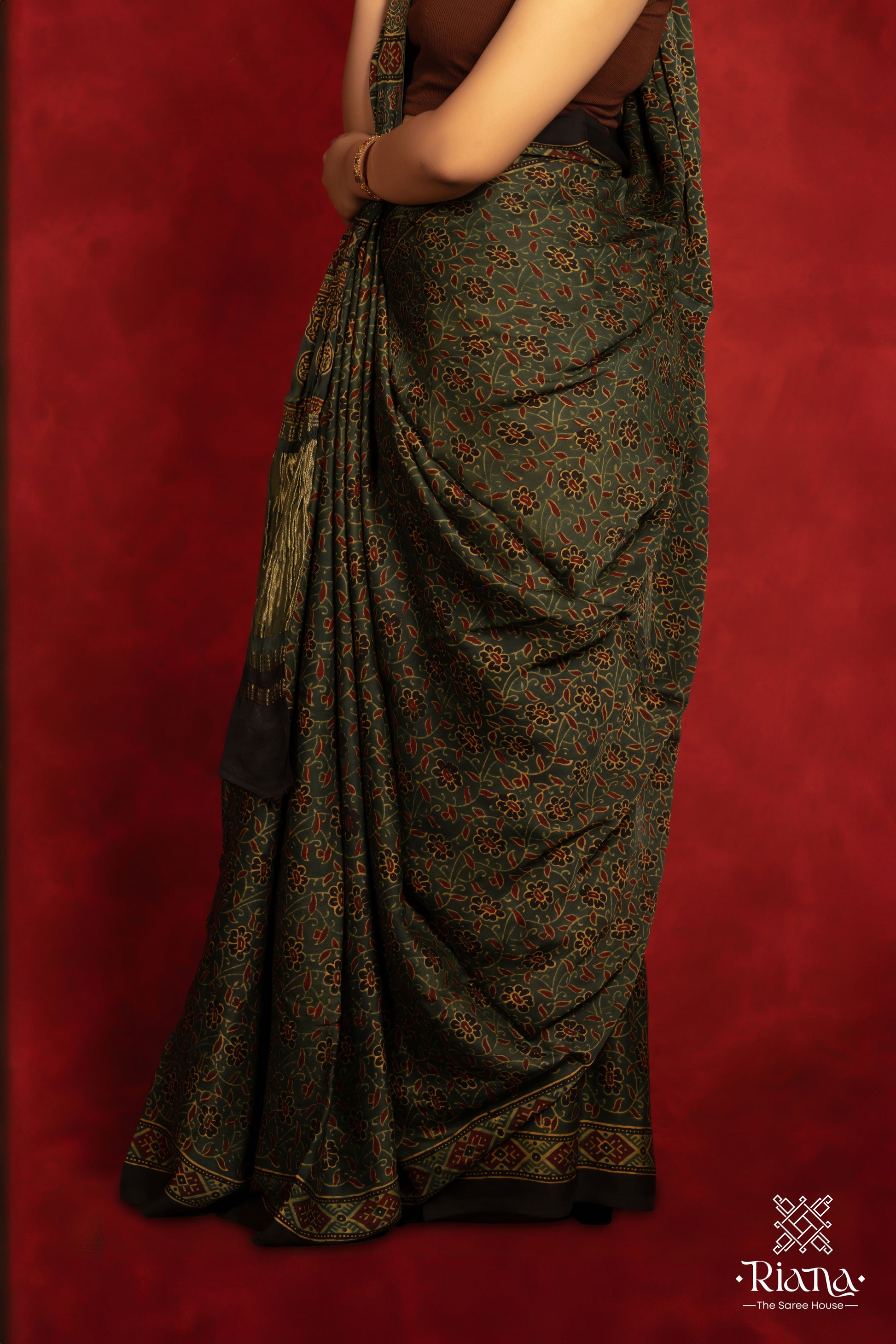 Indulge in the luxury of our Modal Silk Handprinted Ajrakh Saree, crafted with natural dyes. Each piece features intricate Ajrakh patterns, showcasing traditional artistry. The soft, lustrous modal silk drapes beautifully, making it perfect for any occasion. Embrace timeless elegance with this eco-friendly, handcrafted masterpiece.